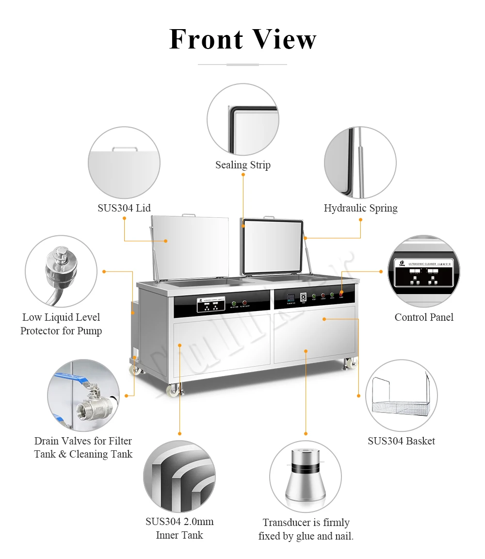 6,28 частоты kHz и 40kHz ультразвуковые доступны для клиентов выбрать, 28kHz соответствующее для чистки тяжелого горючего больших workpieces, и 40kHz соответствующее для очищать частей точности.