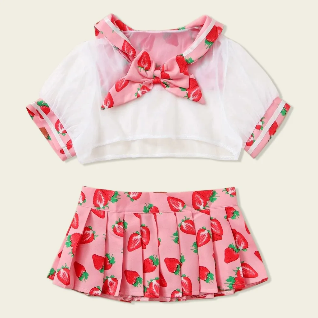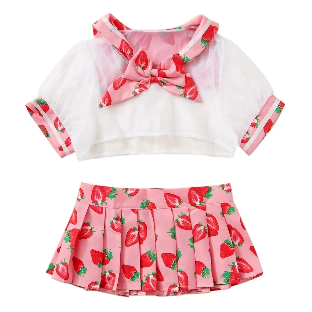 Erotic Cosplay Uniform 2020 Sexy Women Student Mesh Costume Uniform Skirt Pink Strawberry Pattern Lingerie эротические костюмы