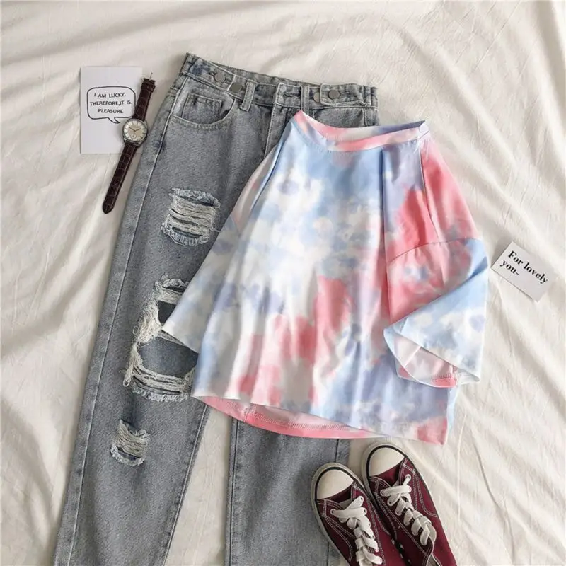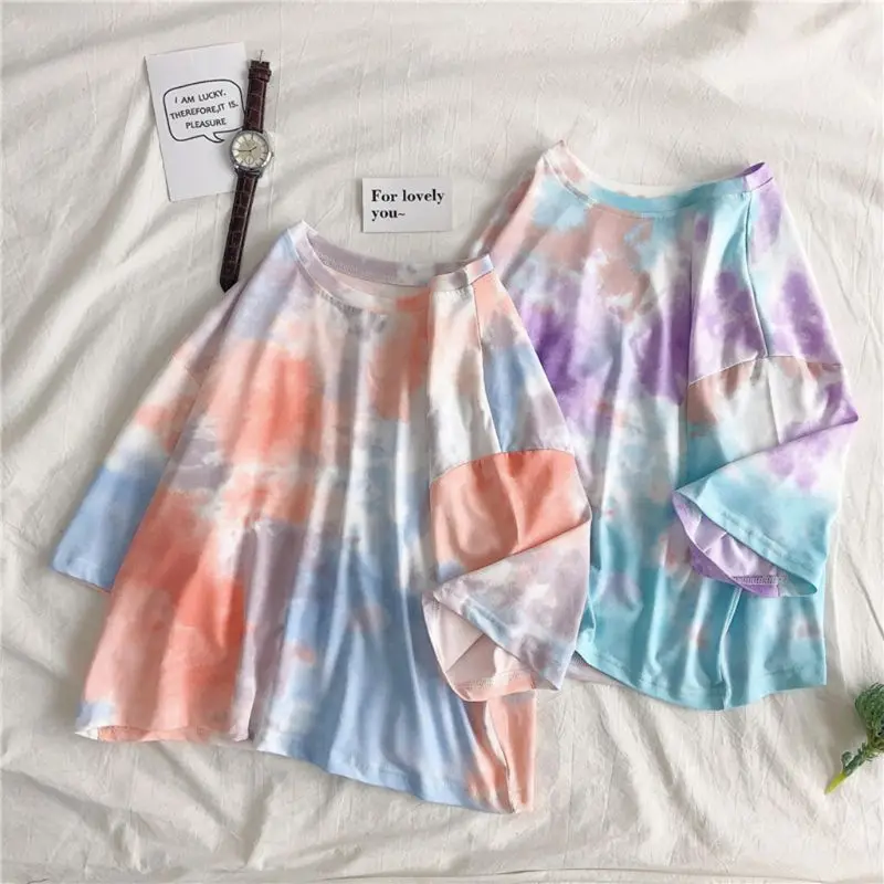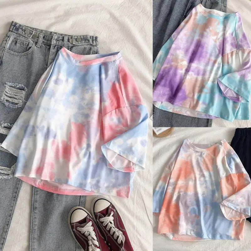 Полурукава, круглый вырез, Повседневный пуловер, свободный крой, стиль Харадзюку, градиентный принт с галстуком-краской.