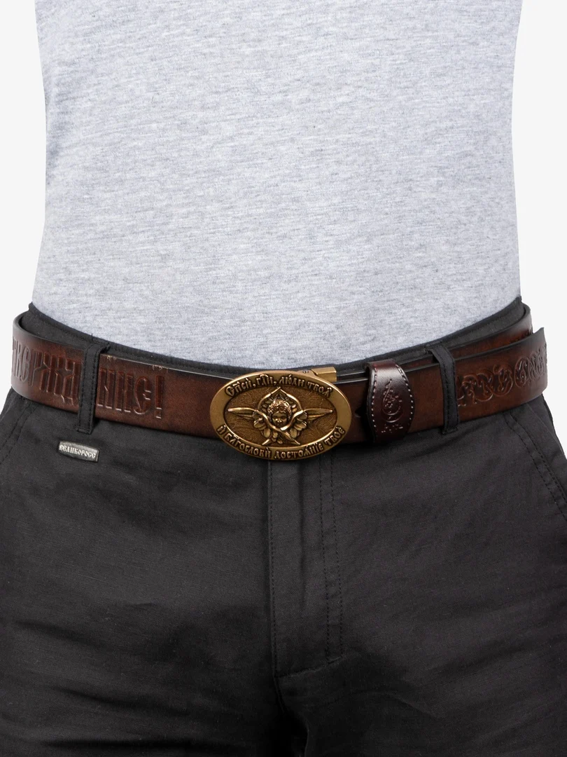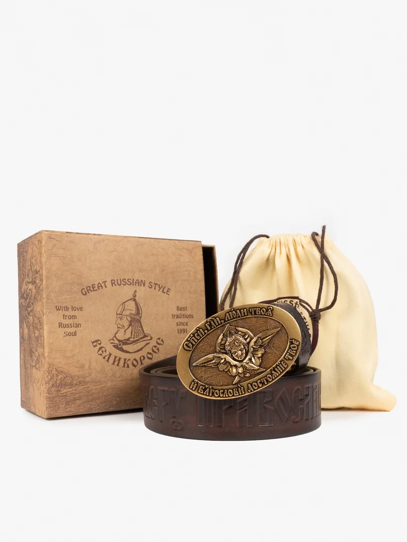 Православный ремень «Успенский» из новой коллекции ремней «Русь Святая». Бляха из мельхиорового сплава цвета старого золота с изображением Херувима.