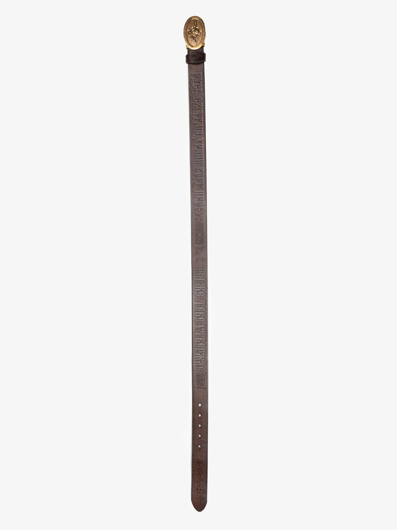 Православный Ремень изготовлен из настоящей воловьей кожи с горячим тиснением на церковнославянском языке 90-го псалма царя Давида «Живый в помощи Вышняго...», молитвы Животворящему Кресту Господню «Да воскреснет Бог, и расточатся врази Его...» и самое настоящее каноническое изображение Православного Креста и Голгофы!