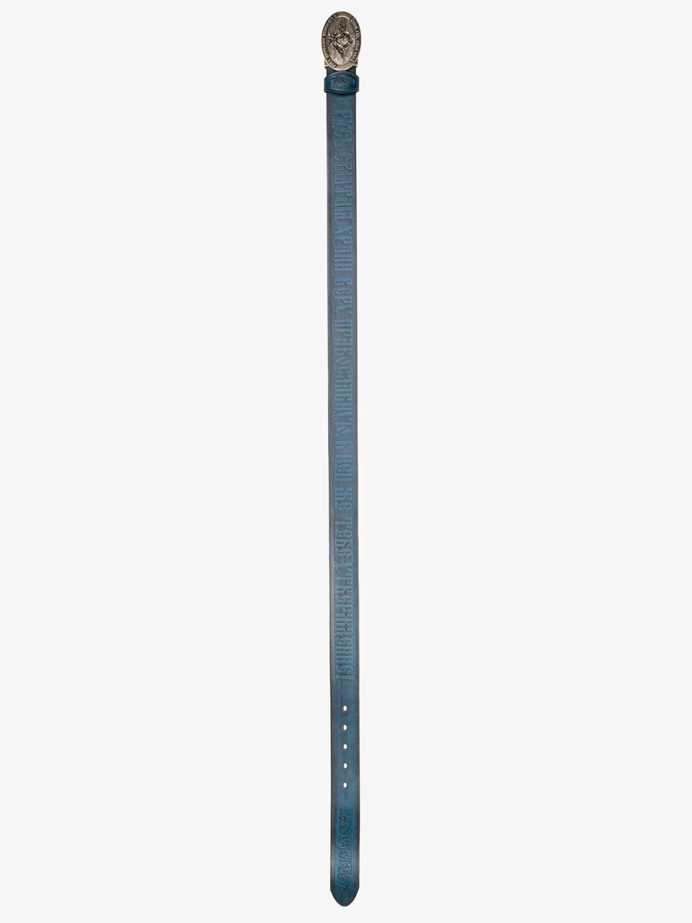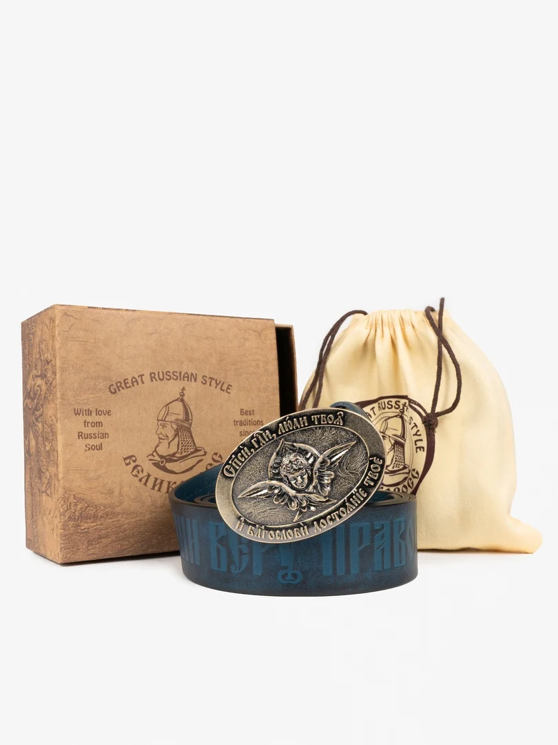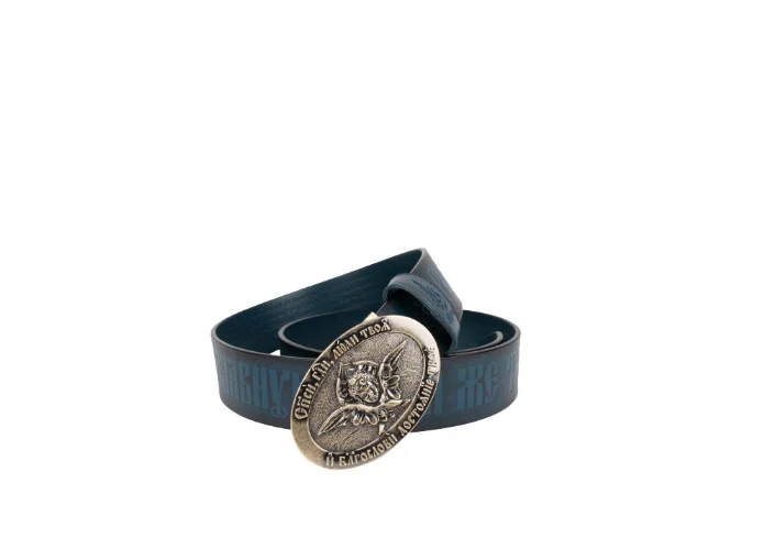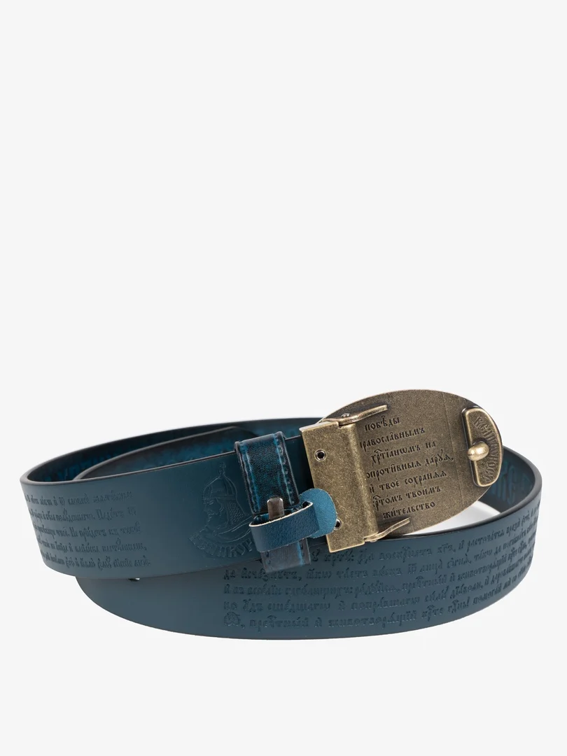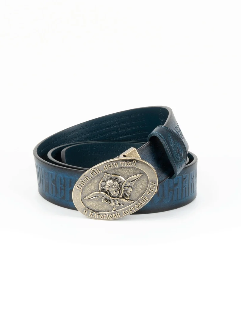 Православный ремень изготовлен из настоящей воловьей кожи с горячим тиснением на церковнославянском языке 90-го псалма царя Давида «Живый в помощи Вышняго...», молитвы Животворящему Кресту Господню «Да воскреснет Бог, и расточатся врази Его...» и самое настоящее каноническое изображение Православного Креста и Голгофы!