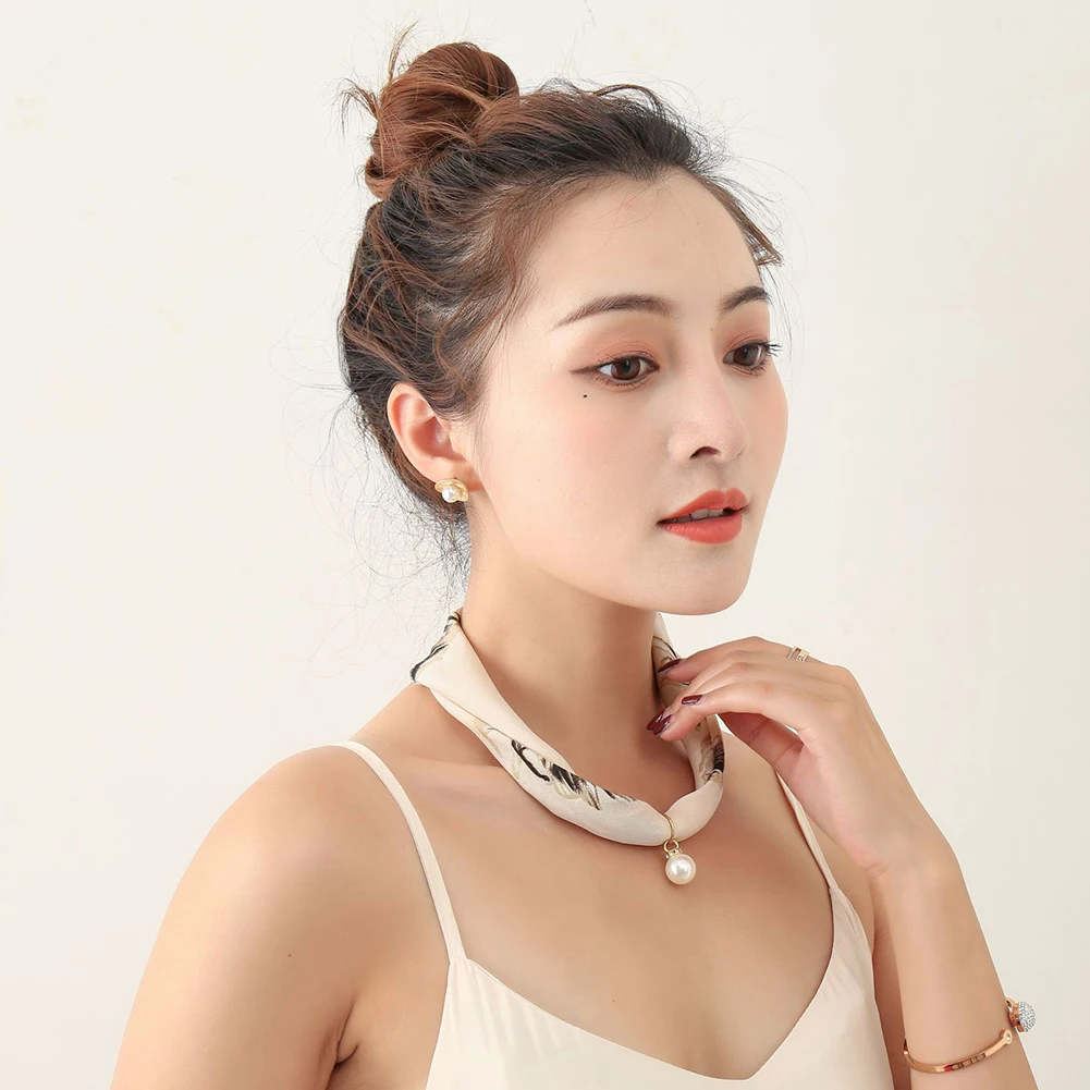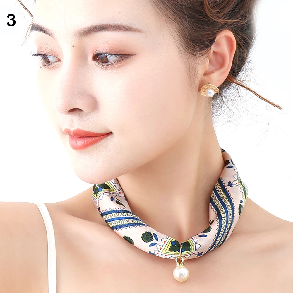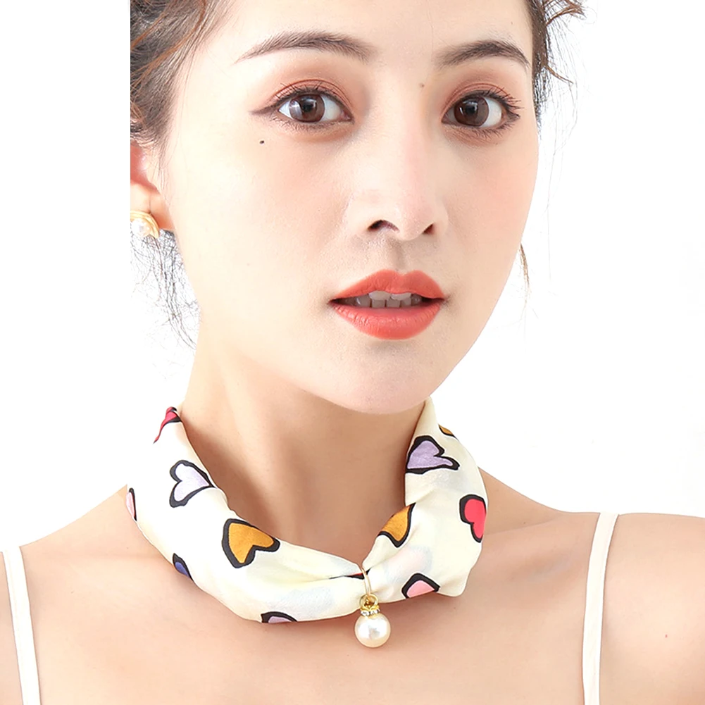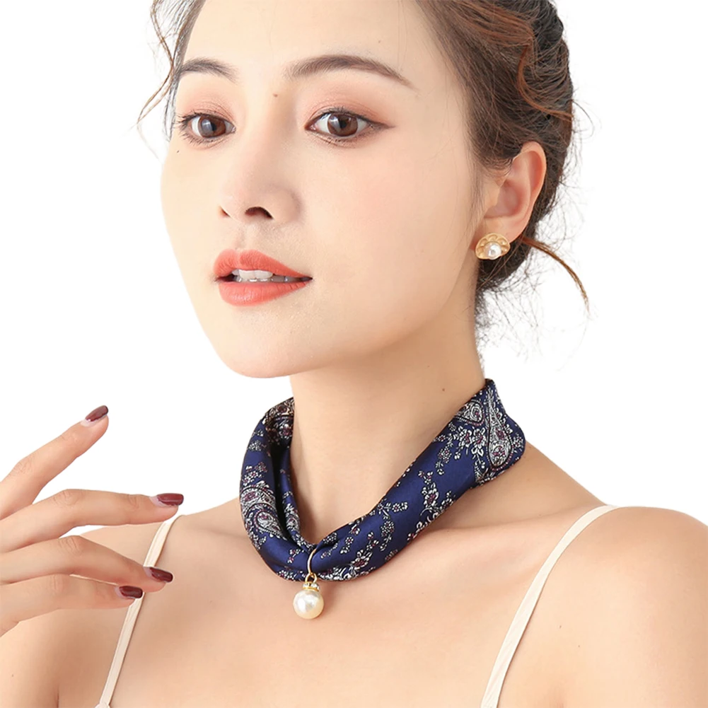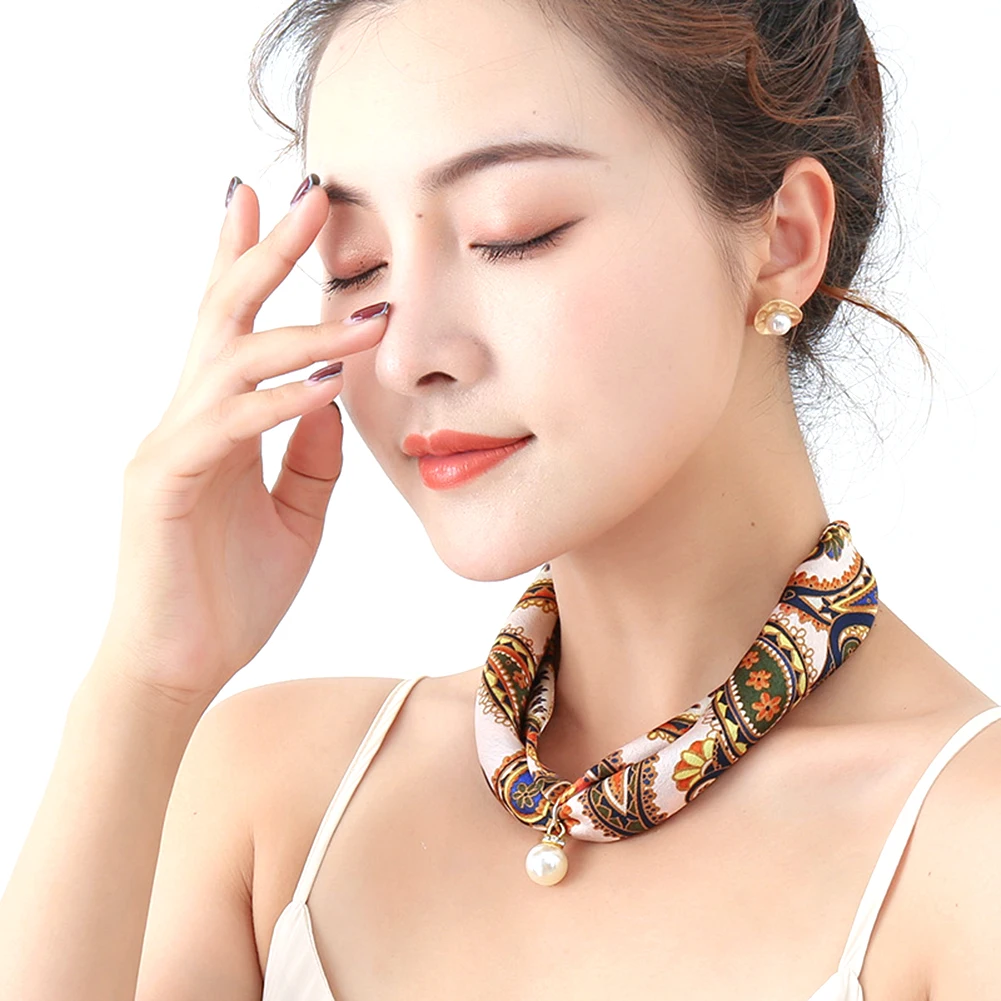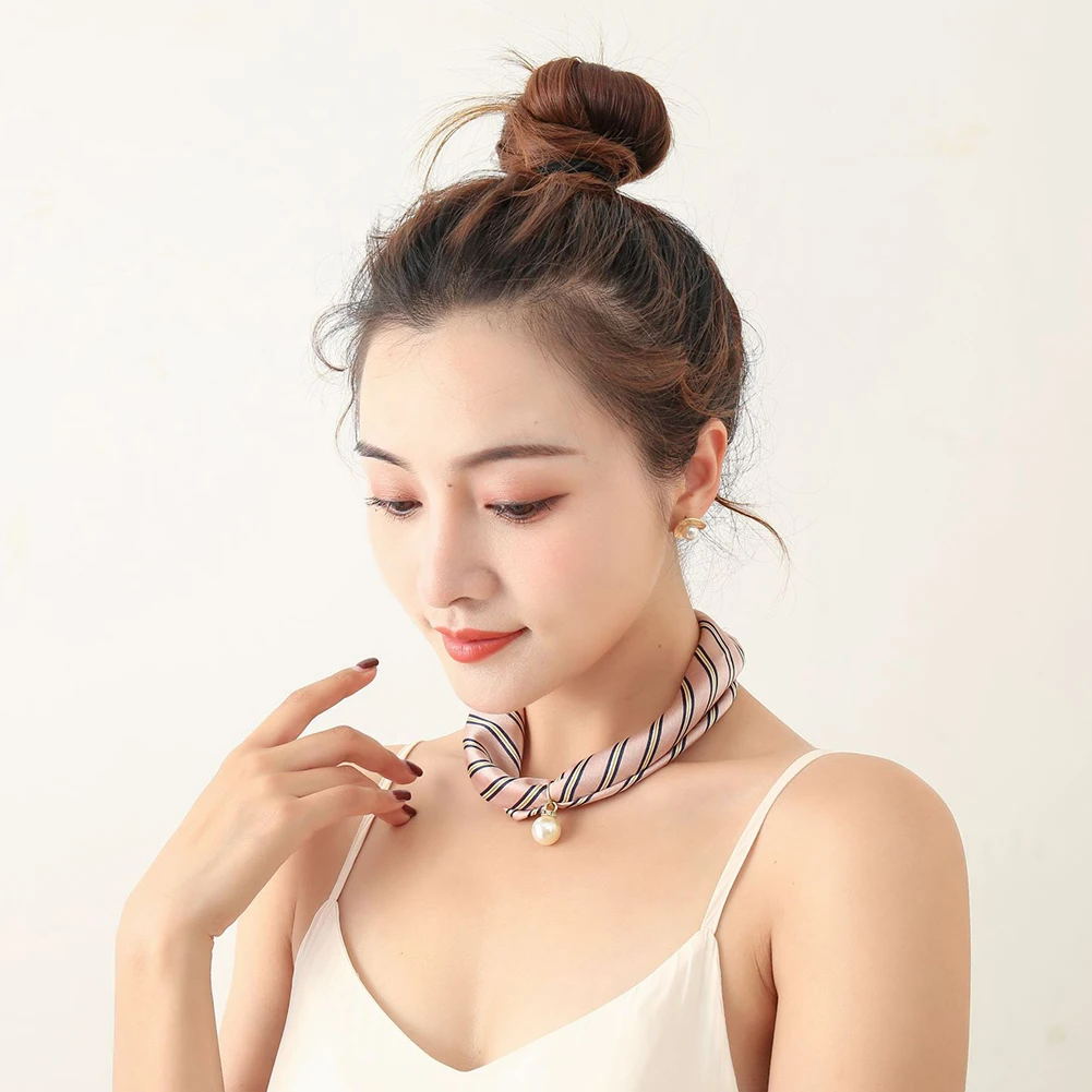 Женский шелковый шарф в полоску с цветочным узором и искусственным жемчугом