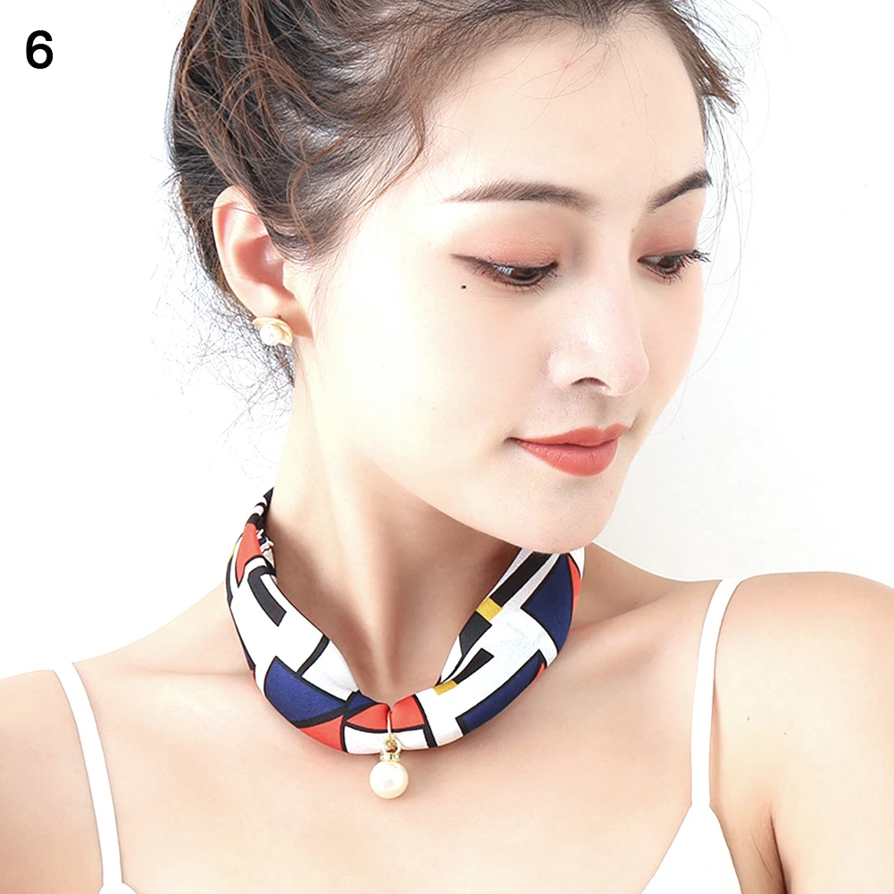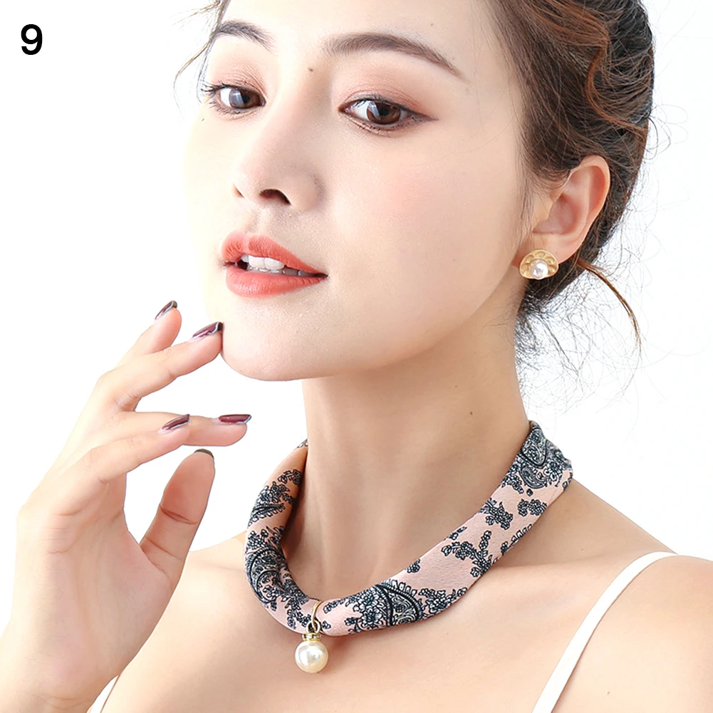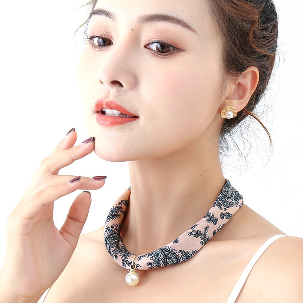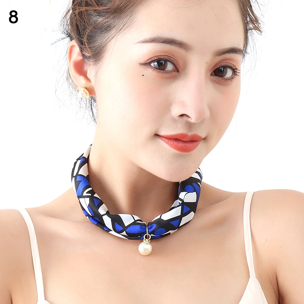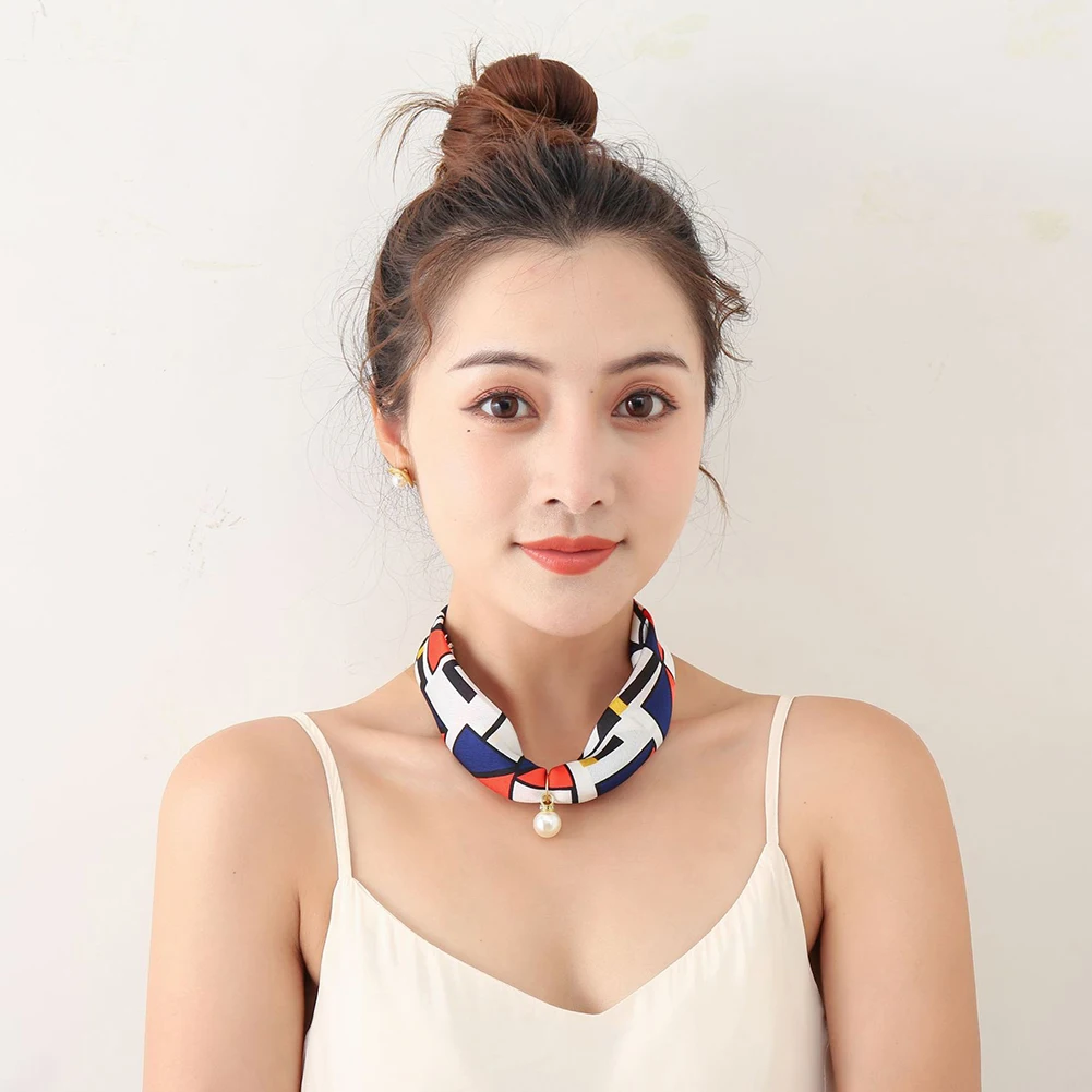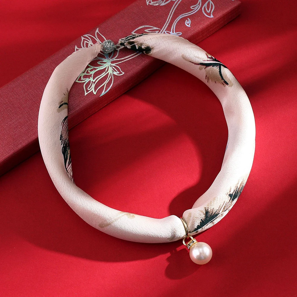 Женский шелковый шарф в полоску с цветочным узором и искусственным жемчугом