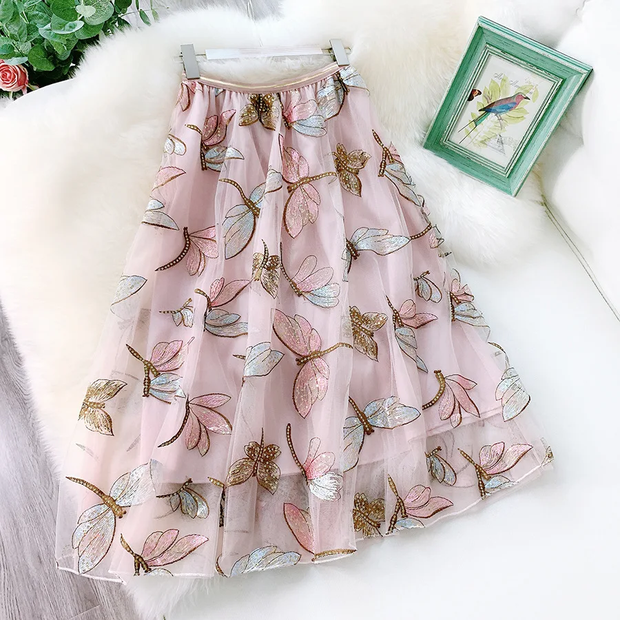 Роскошная юбка из тюля с вышивкой стрекозы, Новинка лета 2021, юбка-пачка Феи из блестящей сетки с высокой талией