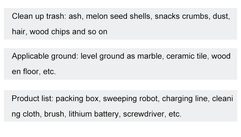 3. Состояние зарядки: светильник индикатора зарядки включен. Указывая, что зарядка заряжается, а выключение означает, что зарядка завершена, а общее время зарядки составляет около 2-3 часов. Функция: Запуск одной кнопкой, подметание, уборка, пылесос, зарядка через USB, универсальное вождение, автоматическое Предотвращение препятствий, защита от падения, низкий уровень шума, интимное, низкое повторение, высокий охват