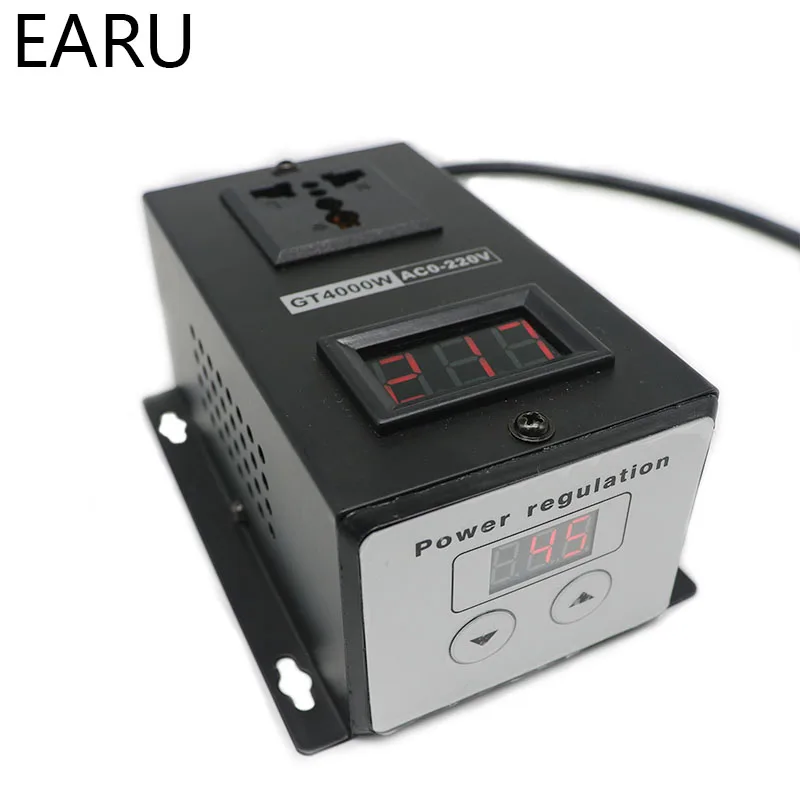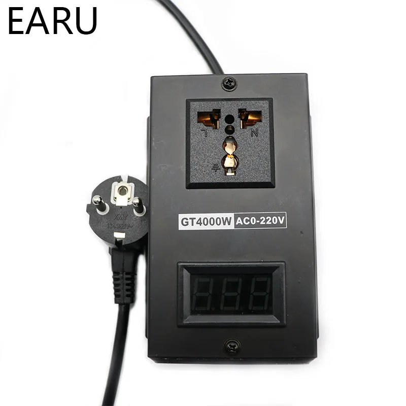 Catious: The device can only be adjusted with at least 20W wattage! Item Name:Single phase electronic voltage regulator Input Voltage :AC 220V EU PLug Output Voltage :AC 10-220V Adjustable (output Voltage less than 5V ,the voltage meter won't work) Peak power:4000W (When input 220v) Voltage adjust Range: AC 0-220V (connect to Load), Rated current:9A Peak current:18A Features: Zero hysteresis, zero delay, with peak voltage absorption circuit, effectively protect high-power thyristor, anti-surge, anti-spike, multiple protection Size:13*7.5*6cm Power supply cable long about 82cm Notice: Need connect to greater than 10W load will have Output voltage , The max power mean work for Resistive load , if connect to inductive load the power about is max power 1/3