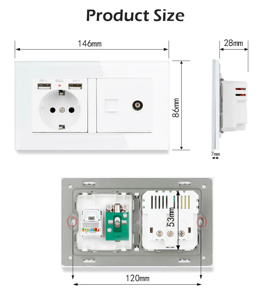 UNKAS Роскошная стеклянная панель настенная розетка стандарта ЕС 2 USB зарядный порт скрытый мягкий светодиодный + RJ11 телефонный и женский ТВ-разъем