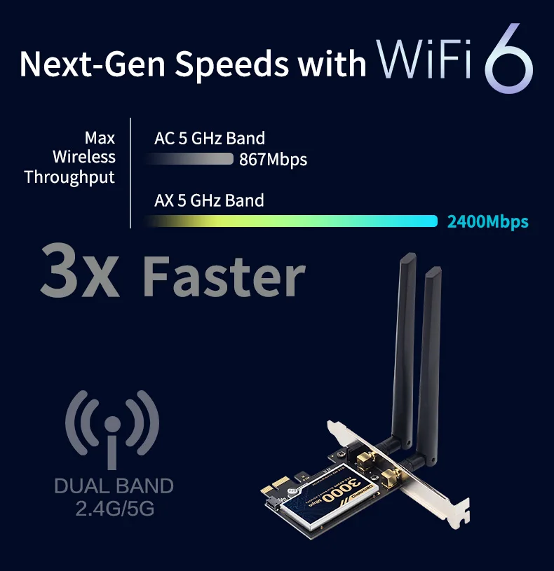В PCE-AX200 адаптер поддерживает Bluetooth 5,1 и 802.11ac/ax Wi-Fi 6, В том числе wave 2 функции, такие как 160 МГц каналов. Доставка до 2,4 Гбит/с и нисходящий канал MU-MIMO В качестве беспроводного доступа в Интернет Wi-Fi 6 адаптер переменного тока, он поддерживает 802.11ax весит более 2x2 MU-MIMO усики, И пиковая пропускная способность 2,4 Гбит/с, с поддержкой и Wi-Fi 5 ГГц и 2,4 ГГц. Обратите внимание: если ваша поддержка маршрутизатора 802.11ax, максимальная скорость может достигать 2,4 Гбит/с