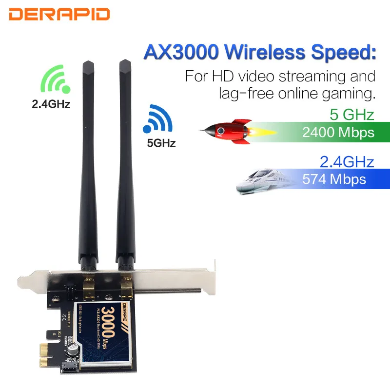 Бренд: DERAPID Модель: PCE-AX200 настольный адаптер Wi-Fi Chipest: Intel AX200 Chipest Стандартный IEEE: 802.11ac/ax С Blutetooth 5,1 Двухдиапазонный 2,4 ГГц-574 Мбит/с/5Ghz-2400Mbps Поддержка MU-MIMO Примечание: Скорость до 2400 Мбит/с (маршрутизатор должен поддерживать 802.11ax) Операционными системами: только в том случае, Поддержка Windows 10 * 64bit Совместимость с почти компьютером с PCI Express (PCI-E 1X/4X/16X slot) Intertaces