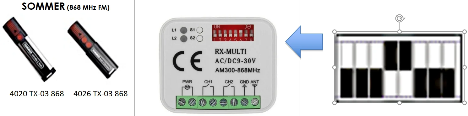 1)Name: Universal RX MULTI receiver 2)Operating Voltage: 9V-30V AC DC 3)Channel: 2. 4)Frequency: 300MHz - 900MHZ 5)Code: Rolling and Fixed code & Learning code