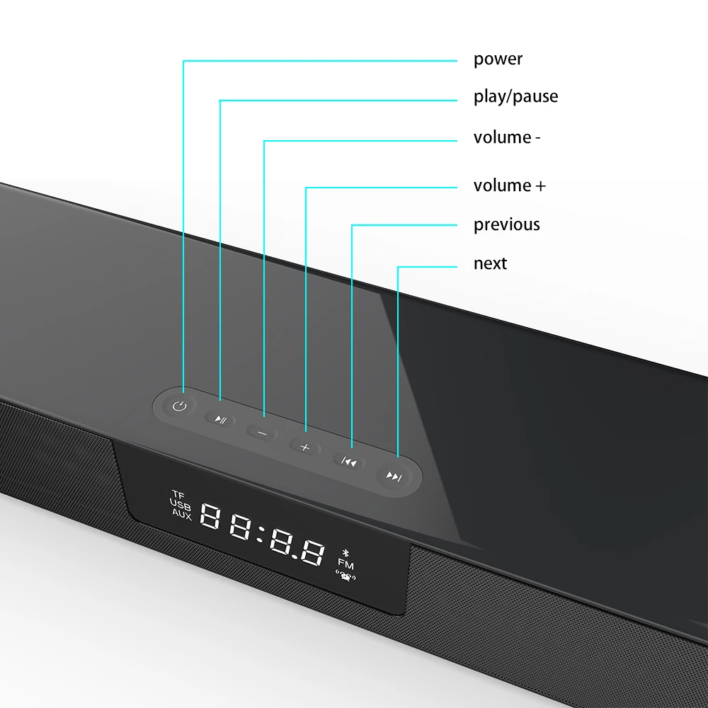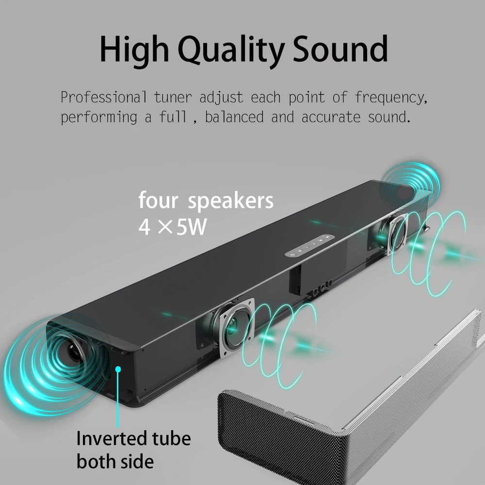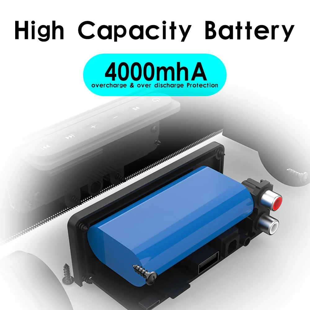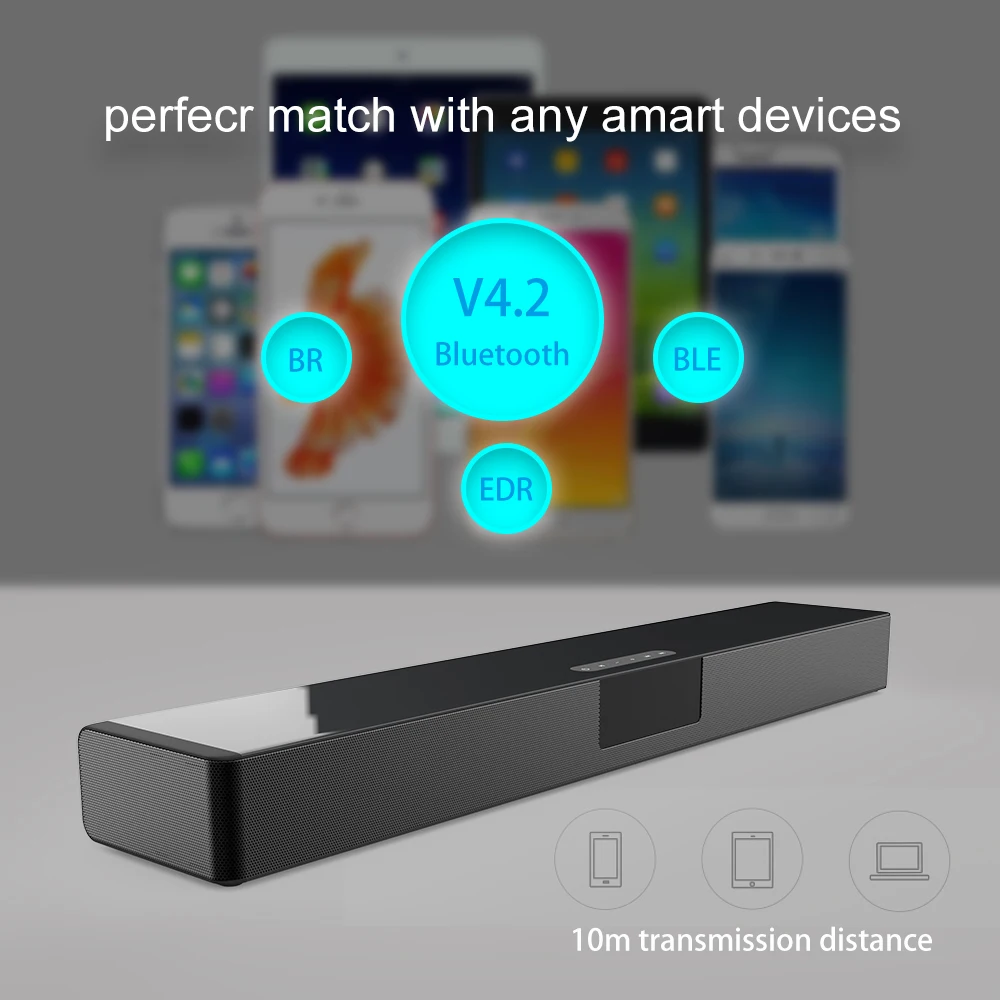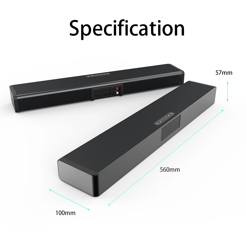 Канал: 2,0 1. Версия Bluetooth: V5.0 2. Динамик: 5 Вт * 4 3. Расстояние между Bluetooth: 10 м 4. Батарея Емкость: 4000mA 3,7 V 5. Номинальное напряжение: 5 В постоянного тока 6. Время воспроизведения музыки: около 7 часов. 7. Время в режиме ожидания: 120 часов. 8. 1 а Время зарядки: около 5 часов. 9. Аудиовход: Bluetooth, USB, 3,5 мм Aux, TF карта, RCA, оптический 10. Размеры: 561x102x57 мм/ 22,08 дюйма x 4,02 дюйма x 2,24 дюйма 11. Вес нетто: 1260 г 12. Беспроводная зарядка QI: обеспечивает 3000 мАч для телефона 13. Воспроизведение музыки + беспроводной QI Зарядка: 1500 мАч для телефона и 1,5 часами проигрывания во время езды 14. Аксессуары: зарядный кабель, 3,5 мм-RCA кабель, 3,5 мм аудио Кабель, оптический кабель, пульт дистанционного управления, Руководство по эксплуатации Поддержка ТВ/ПК/телефон/планшет/ноутбук/MP3/M P4/DVD-плеер/Аудио ТВ-приставка
