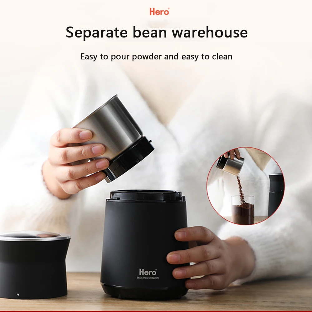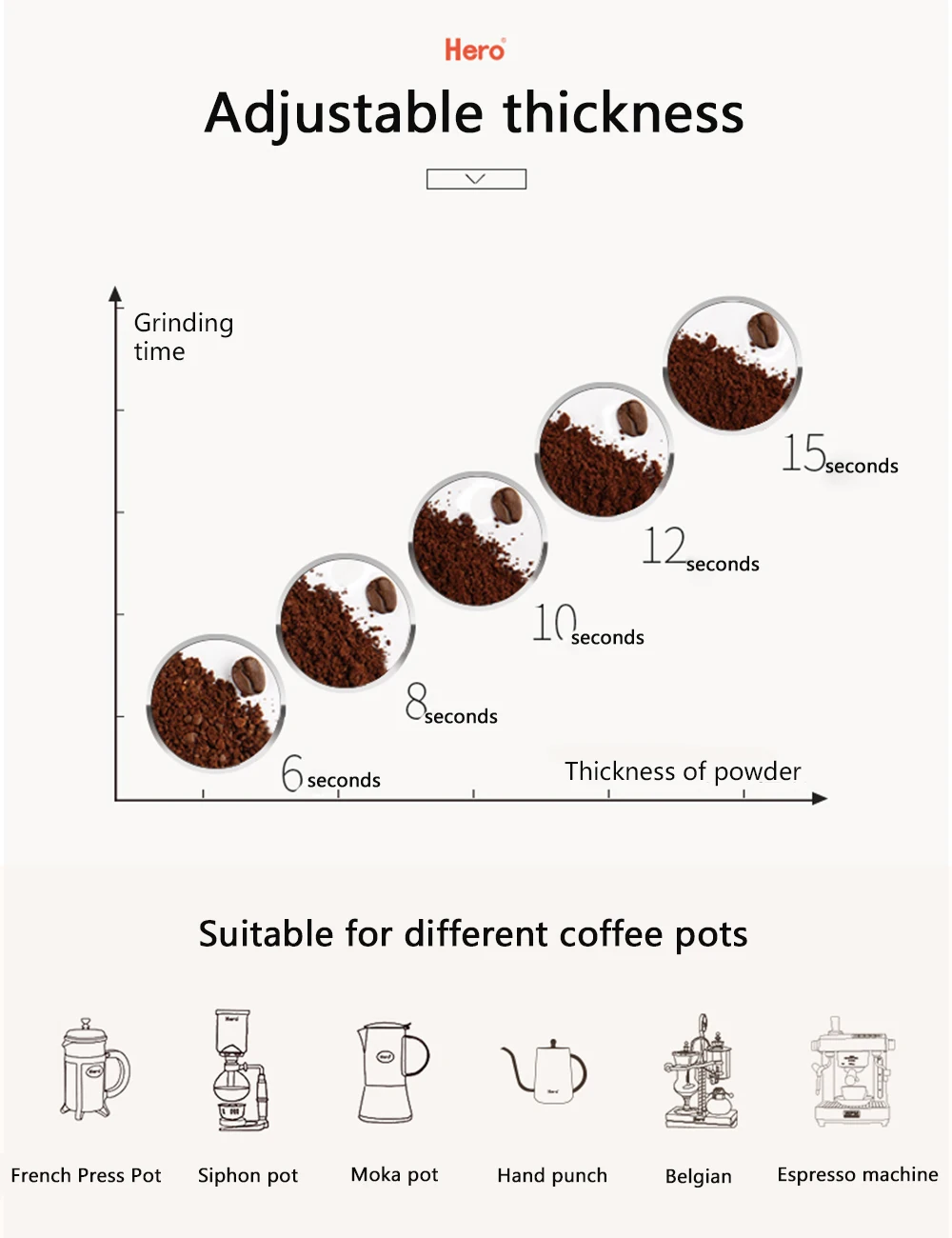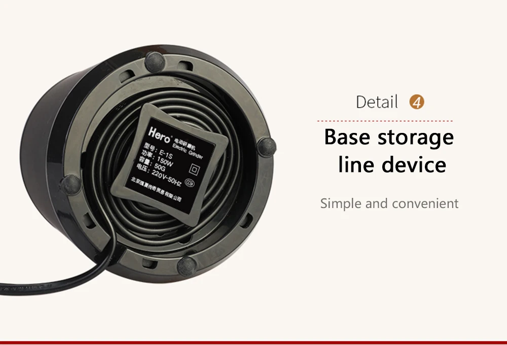 Торговая марка: Hero Напряжение: 220-50 Гц Номинальная мощность: 150 Вт Ёмкость: 50 г Размеры: 10 * 18cантиметров Характеристики штекера: двухконтактный разъем Материал: нержавеющая сталь, лак для выпечки может измельчать все виды ингредиентов: приправа, кофейные зерна, зерна, фрукты и овощи, китайская медицина и т. д. Толщина шлифовки может контролироваться Для различных кофейники Пожалуйста, обратите внимание, что эта модель имеет 2 характеристики, одиночную чашку шлифовщика и двойную чашку шлифовщика