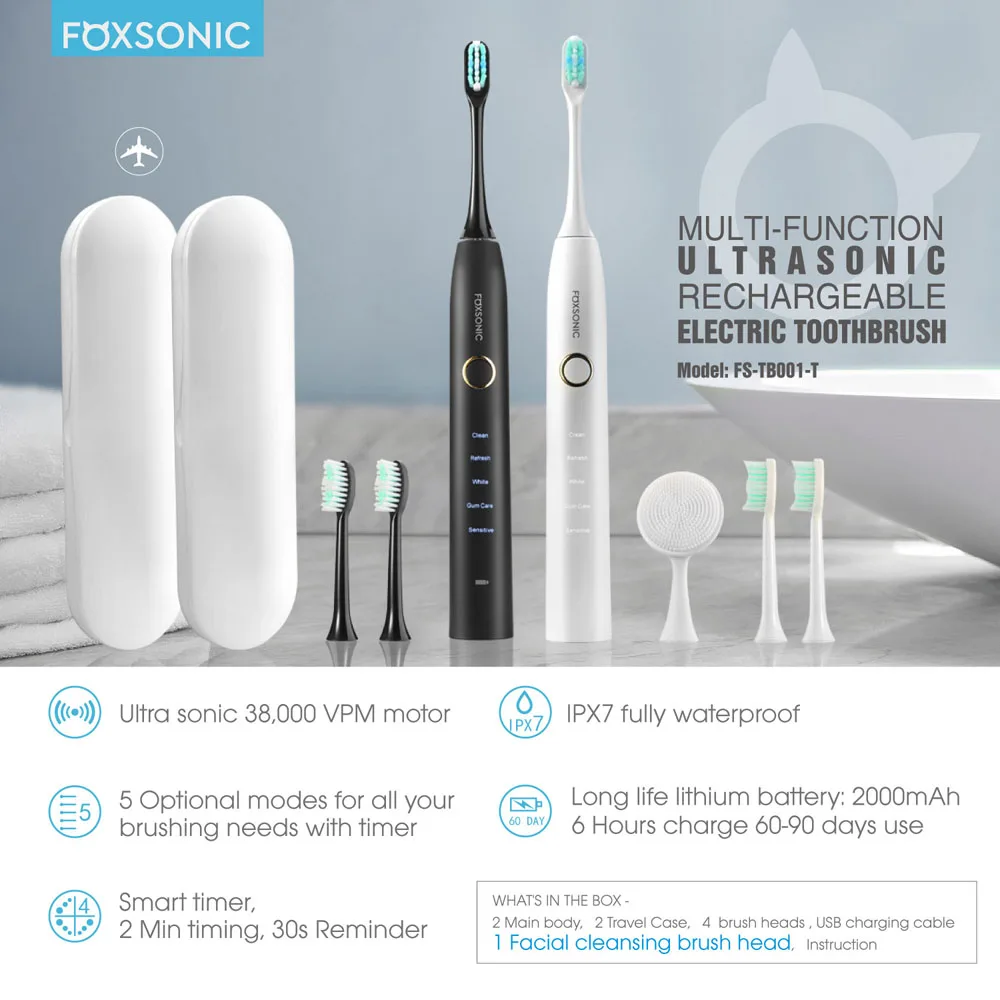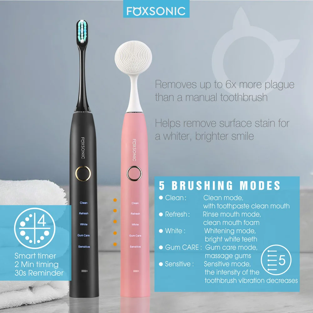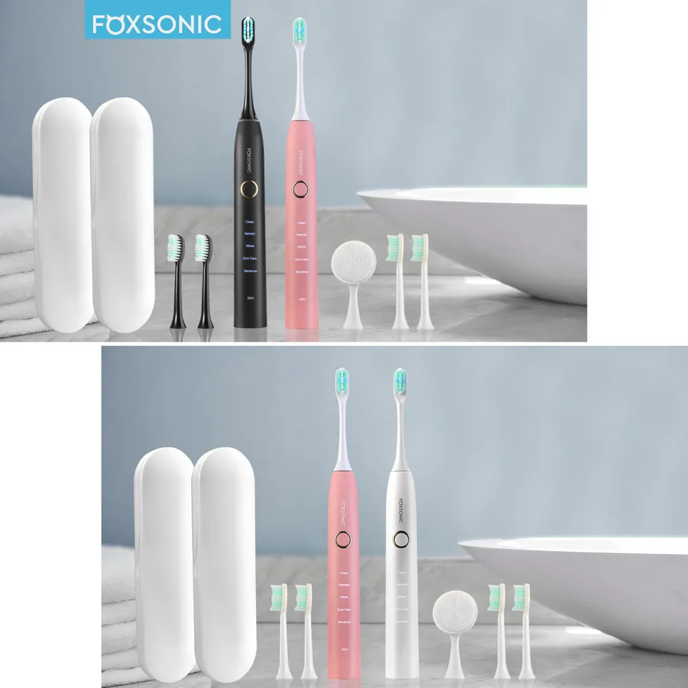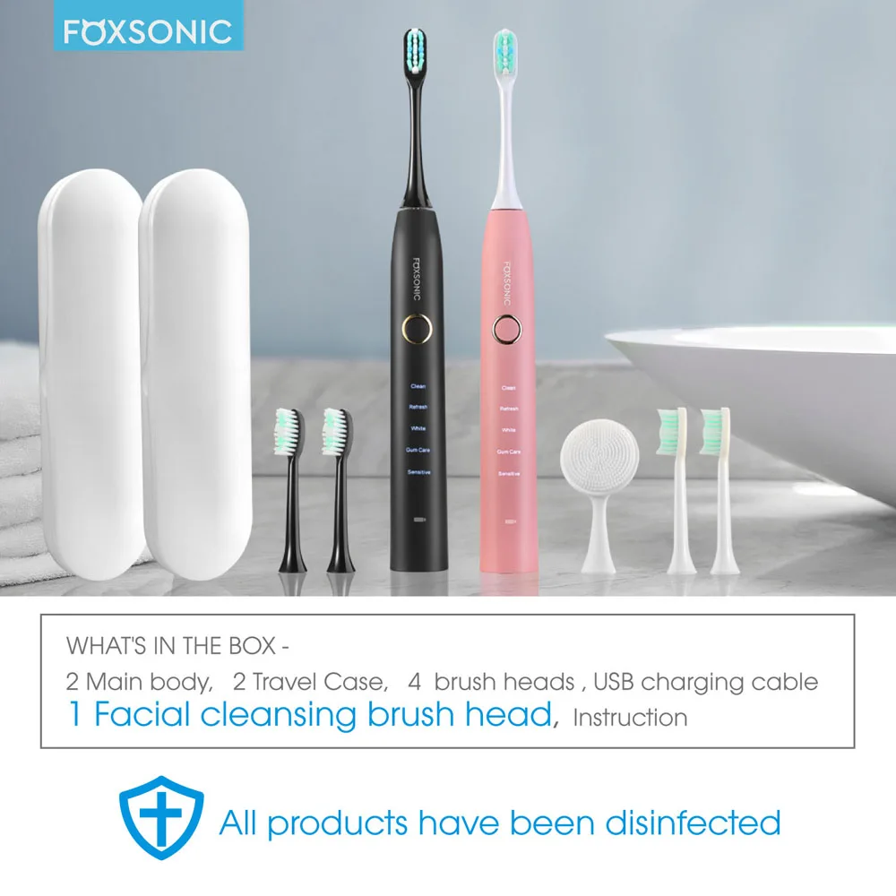 Электрическая перезаряжаемая зубная щетка FOXSONIC для влюбленных и семейных пар, 5 режимов со встроенным таймером 2 минуты, рекомендуемые стоматологи, с очищающей щеткой для лица, спа-салон для лица, Дорожный Чехол