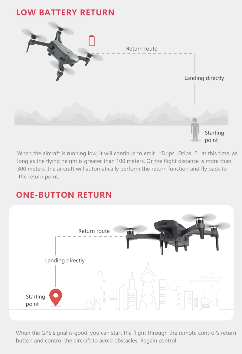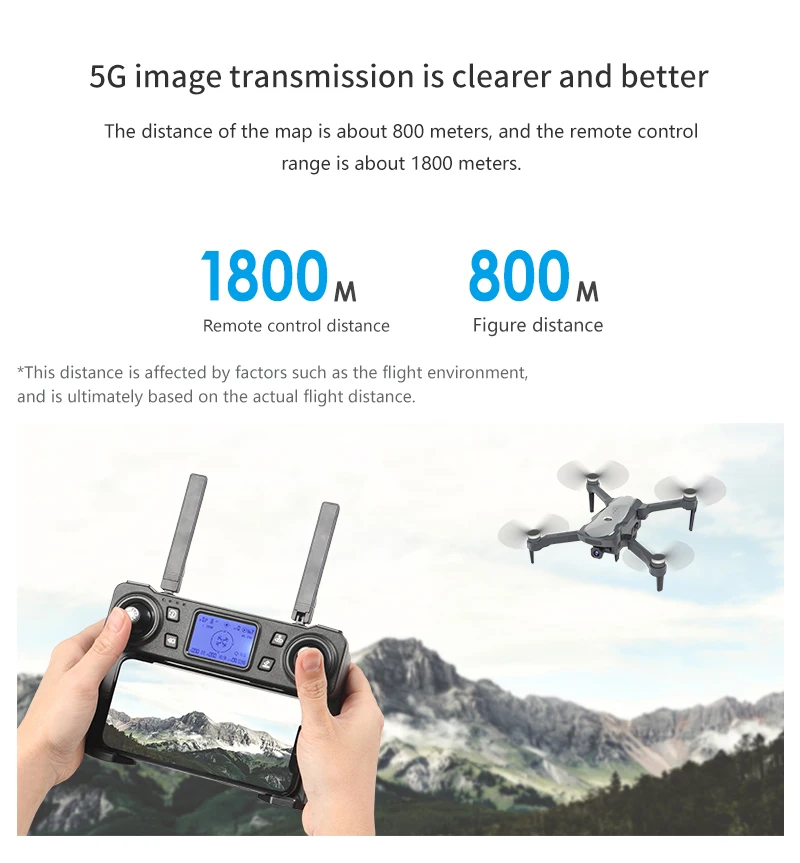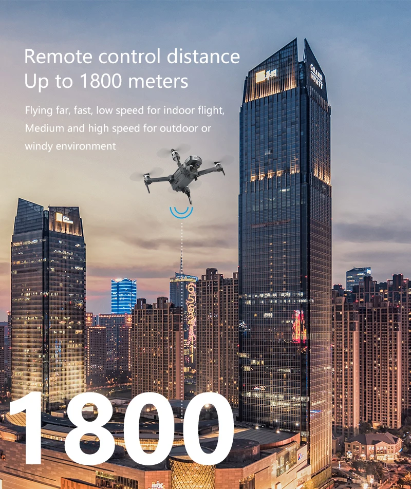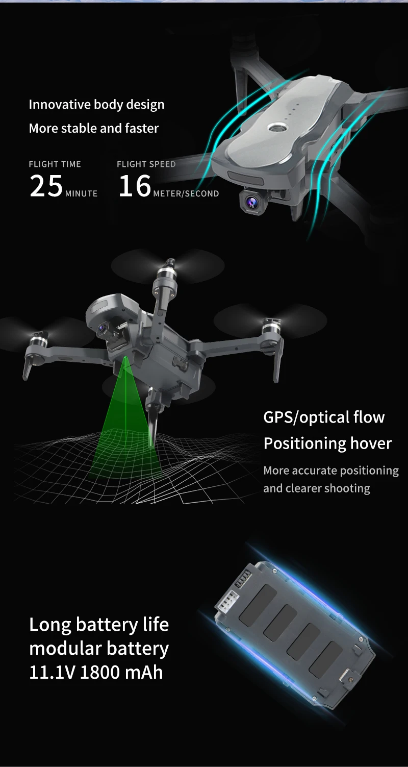 -1800 mAh high-capacity battery with a flight time of up to 25 minutes and a flight speed of 16 m/s- WIFI WIFI camera version come with 4K HD Gimbal camera., 110° wide angle, ESC angle 75°- Uses environmental protection ABS materials and 4Pcs Brushless Motor to make the flight even more powerful.- With GPS and optical flow modes are switched at will, GPS optical flow mode can set Fixed height and achieve " Follow me function".- With smart Surround shooting shooting mode, one key 360° Surround shooting mode allows you to take a perfect selfie video around yourself.- With Headless Mode,no need to adjust the position of aircraft before flying .- One key to return function makes it easily to find the way home. Failsafe Return to home.- With low power alarm, transmitter will emit "di-di-" sound when the drone lack of power.- With auto return function, drone will return to the location where the transmitter is when lost connection to the transmitter.- With Follow me function, aircraft follower remote controller,arbitrary and easy manipulation.Telemetry and mission planner by default.- With 2.4G Transmiter/ Easy Adjust Frequency,5G WiFi FPV image transmission- Take a single gesture and shoot, whether you are a professional photographer or not, you can take beautiful pictures for you.- 6-axis gyro fly system makes more stable and flexible flight.