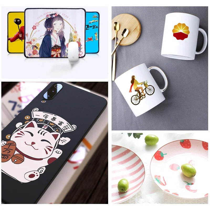 Переводная печать: футболка из нечистого хлопка (содержание менее 30% хлопка), керамические чашки и тарелки, фарфоровые кусочки, пазлы, металлические пластины, перламутровые тарелки, картины из сланца, подушка, школьный портфель, мобильный телефон оболочка, коврик для мыши и другие продукты самолета.