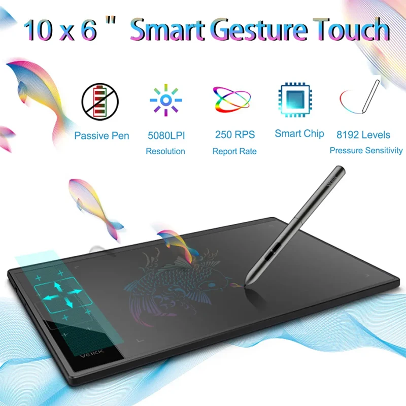 Интеллектуальная Пассивная технология: пассивная ручка с интеллектуальным чипом внутри позволяет свободно рисовать на планшете. Без запутанного провода, без аккумулятора или зарядки. Ручка может отслеживать и захватывать трассировку линии, чтобы линия выходила плавно, как только наконечник скользит на экране. Скорость чтения достигает 250 точек/сек. Высокочувствительный Датчик давления 8192 класса: с датчиком высокой чувствительности планшет может точно ощущать давление, так что штрихи идут плавно и естественно без необходимости прикладывать много усилий. Противоскользящая панель большого размера с разрешением 5080LPI 10 дюймов: обеспечивает точное позиционирование, детальный дисплей и легкий Рисунок без ограничений. Обработка текстуры сзади и Противоскользящие прокладки в четырех направлениях обеспечивают стабильное хранение планшета на столе или другой поверхности. Беспроводное сенсорное управление: Просто используйте пальцы, чтобы скользить по боковому сенсорному экрану, чтобы отрегулировать размер ручки или увеличить и уменьшить область рисования. Вы также можете настроить кнопку управления для удобного использования. Функция «ластик»: Одно нажатие для переключения ручки в режим ластика, чтобы вы могли использовать его, чтобы вытереть ошибки штрихов, так же удобно, как ластик.