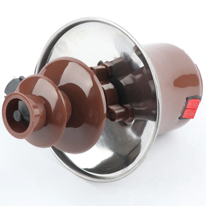 После установки и выравнивания фонтана, Пожалуйста, подключите питание, сначала нажмите кнопку тепла слева, предварительно нагрейте в течение двух минут, затем залейте 2-4 фунта растопленного шоколада в миску из нержавеющей стали. Нажмите кнопку fountian справа. Винт крутится И шоколад подведен к верхней части башни и медленно скользит вниз по верхней части башни, образуя шоколадный водопад, и шоколадный аромат также излучается. Пользователь может использовать вилку для вилки различных Продукты
