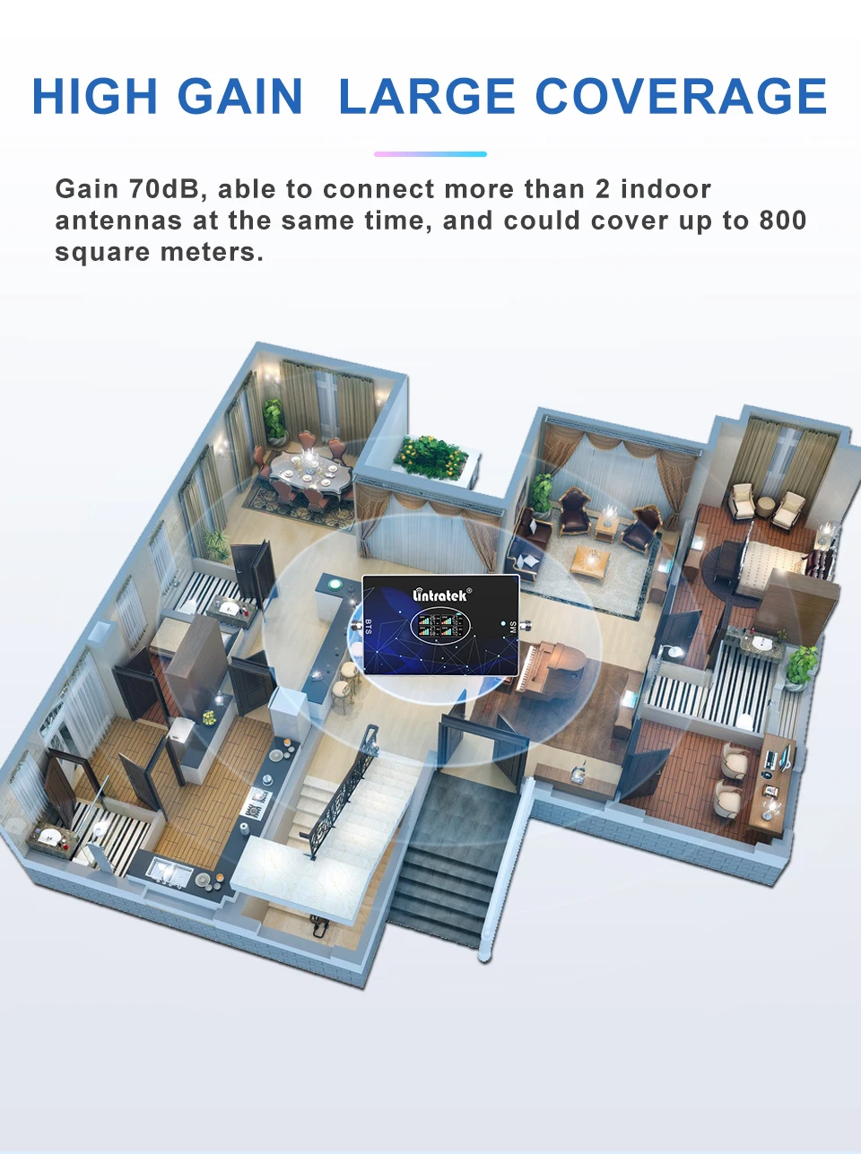 Возможность подключения 1-4 внутренних антенн одновременно, покрывает до 800 кв. М. Большая мощность 20dBm, расширение покрытия, более стабильная производительность.