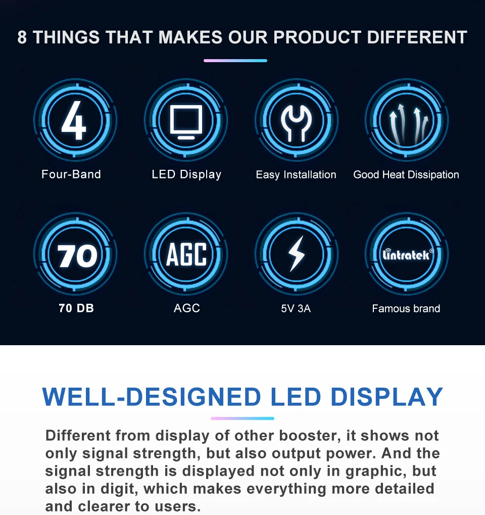 Отличается от отображения другого усилителя, он показывает не только силу сигнала, но и выходную мощность. И сила сигнала отображается не только в графическом, но и в цифре, что делает все более подробным и понятным для пользователей.