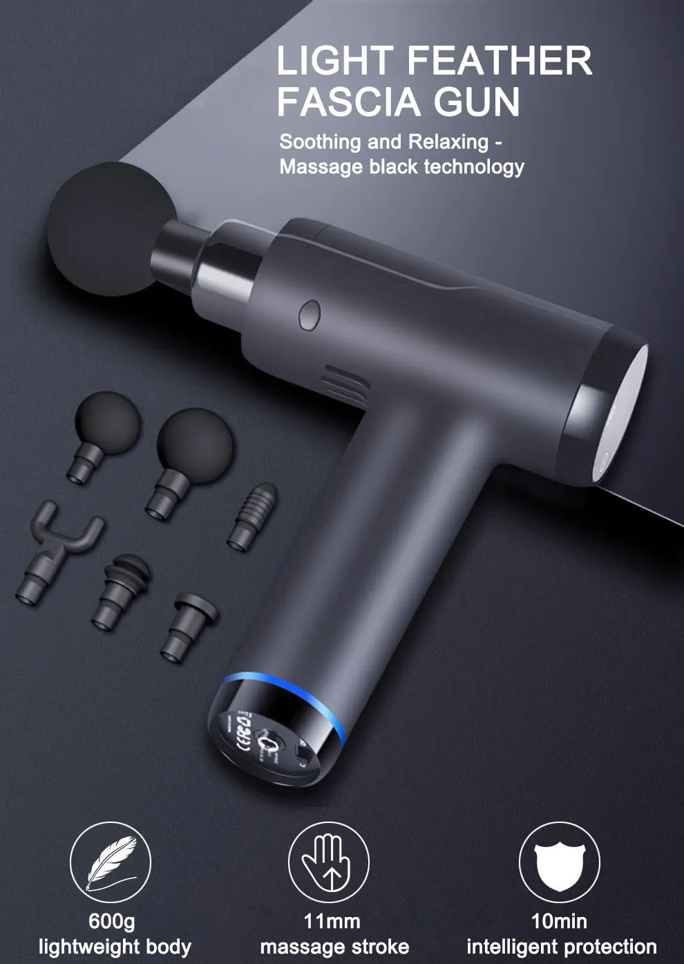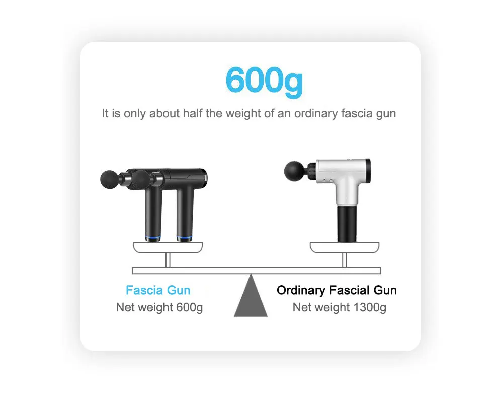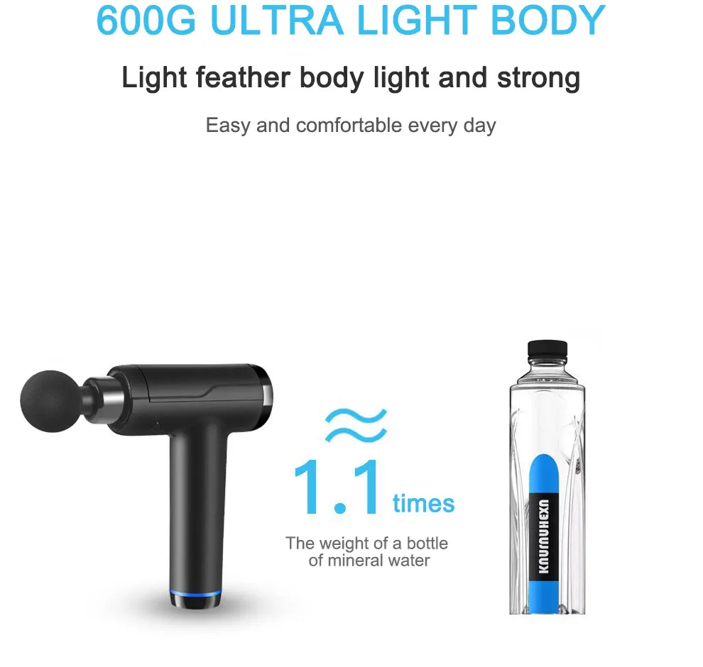 8. Только 600 г: примерно вес бутылки минеральной воды посылка включает в себя: 1 массажный пистолет 6 массажных головок 1 зарядное устройство 1 руководство