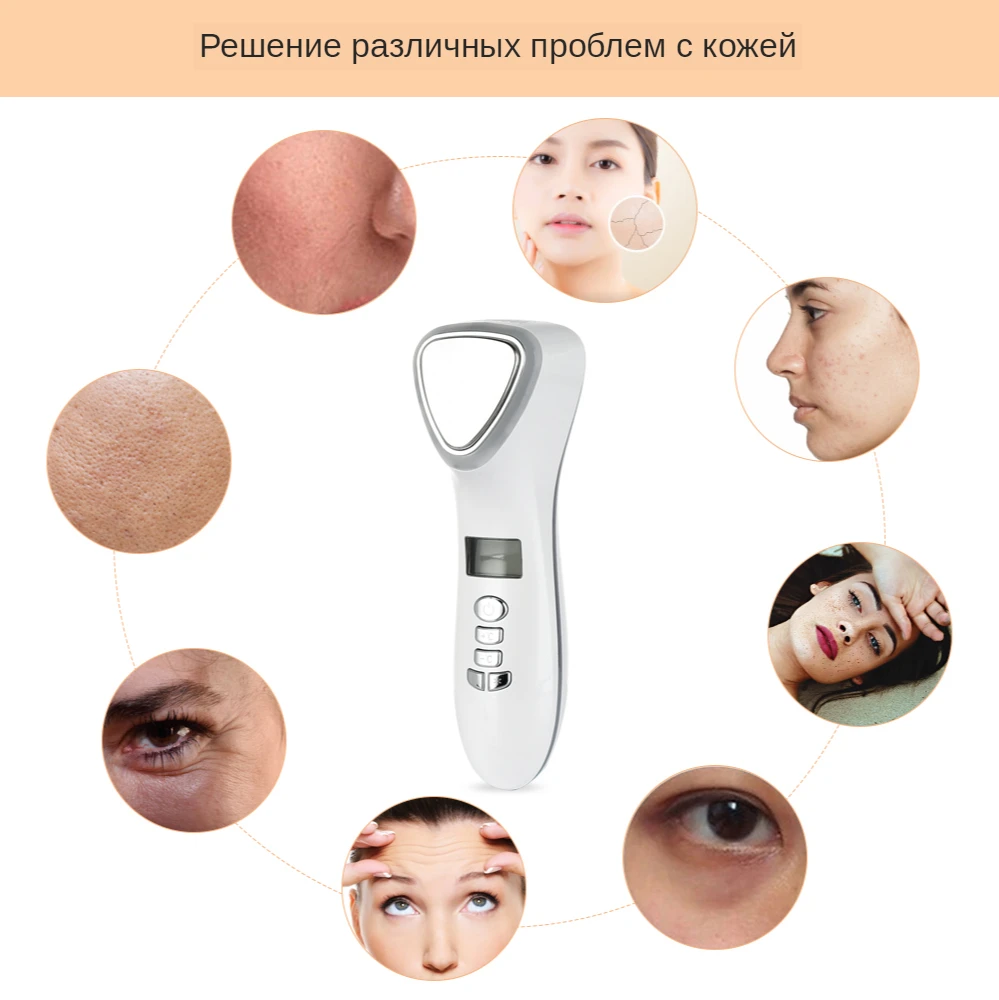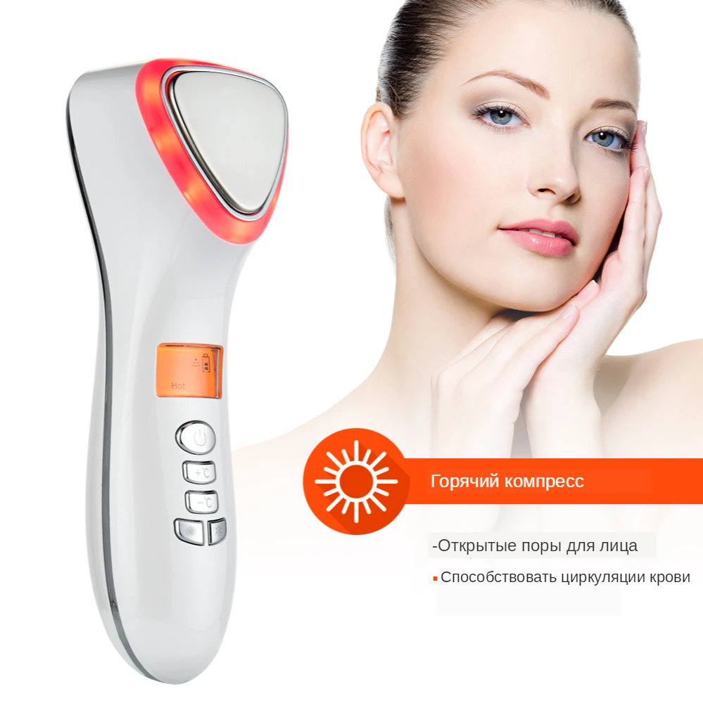Спецификация: 1. Название продукта: 7 светодиодный светильник ультразвуковой горячий холодный массажер для лица 2. Мощность: 1 Вт 3. Номинальное напряжение: DC5V 4. Напряжение: 3,7 В 5. Батарея: 1000 мАч литиевая батарея 6. Материал: АБС-пластик 7. Время зарядки: 2 ч