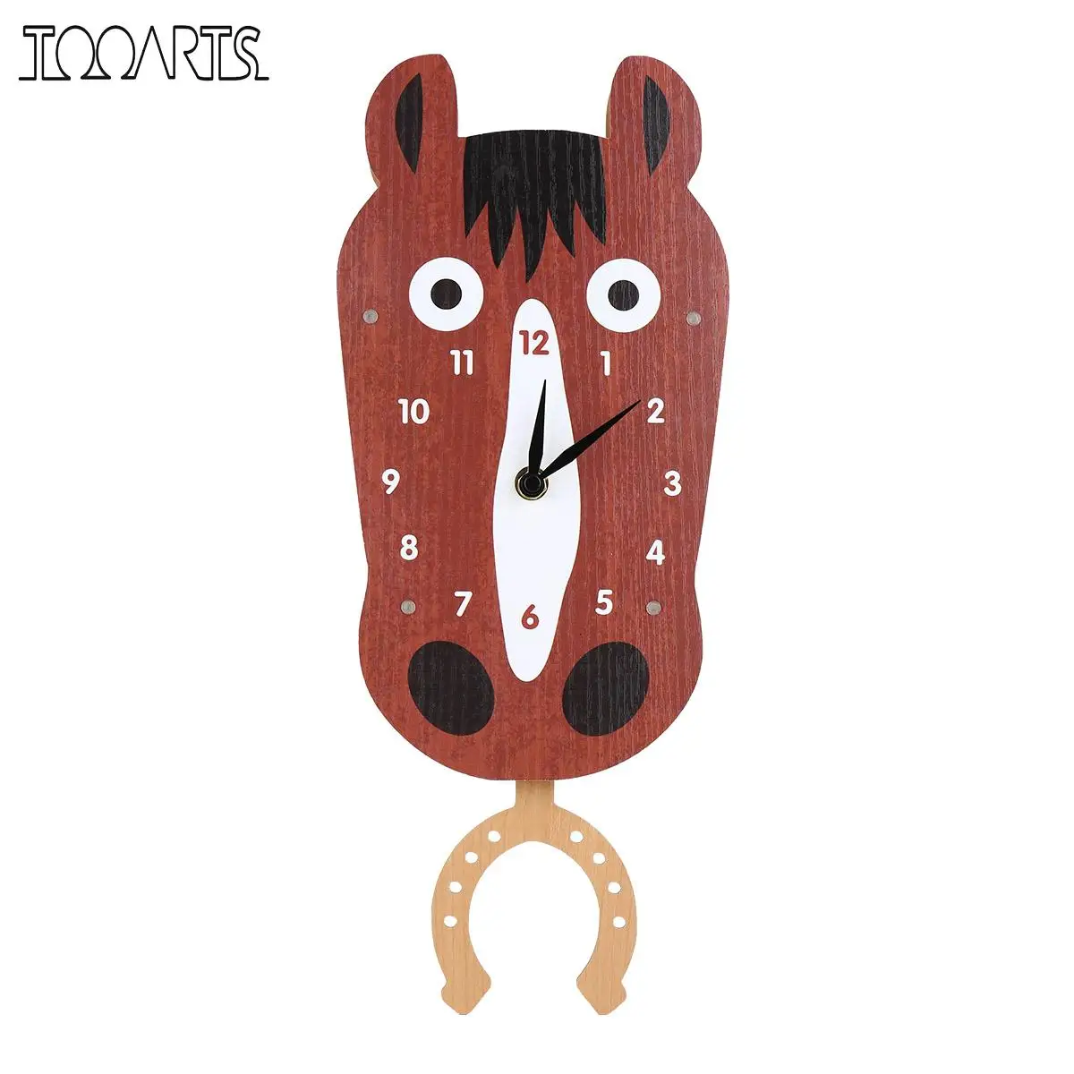 Лицо мультяшного коня-большой циферблат, на длинном носу висит подковка, которая будет следить за часами и качелями. Цифры на поверхности часов может быть читать четко без стеклянной крышкой и рамкой. Простая конструкция интегрированный с лошадью, форма и просты в установке. Он изготовлен из МДФ (ДВП средней плотности, древесно-волокнистая плита средней плотности), материал. Конструкция простая и стабильная, и она питается только одной батареей АА (не входит в комплект). Его необходимо повесить на стену с помощью гвоздей. Часы не имеют тикающий звук, он работает тихо и не шумит, поэтому он не будет мешать вашей работы, учебы или отдыха. Это станет отличным выбором для спальни, кабинеты, и детских комнат. Формы животных и яркие цвета, подходящие по цвету, могут добавить много веселья для гостиной и является очень особенным подарком.