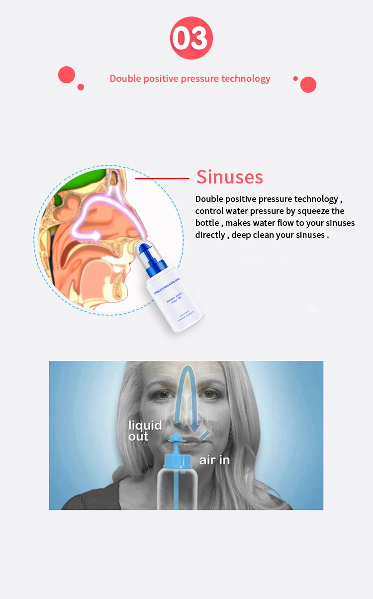 Технология двойного положительного давления, Контролируйте давление воды, выдавливая Бутылка, делает поток воды к вашим sinuses Непосредственно, глубоко очистите ваши пазухи.