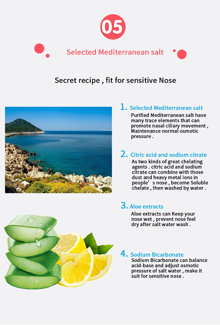 Секретный рецепт, подходит для чувствительного носа 1. Выбранная средиземноморская соль Очищенная средиземноморская соль имеет много микроэлементов, которые могут способствовать носовому килиарному движению, поддерживать нормальное осмотическое давление. 2. Лимонная кислота и цитрат натрия Как два вида отличных хелатиновых агентов. Лимонная кислота и цитрат натрия могут сочетаться с пылью и ионами тяжелых металлов в носу людей, стать растворимым хелатом, затем промыть водой. 3. Экстракты алоэ Экстракт алоэ может держать нос влажным, предотвращает сухость носа после мытья соленой воды. 4. Бикарбонат натрия Бикарбонат натрия может сбалансировать кислотное основание и регулировать осмотическое давление соленой воды, что делает его подходящим для чувствительного носа.