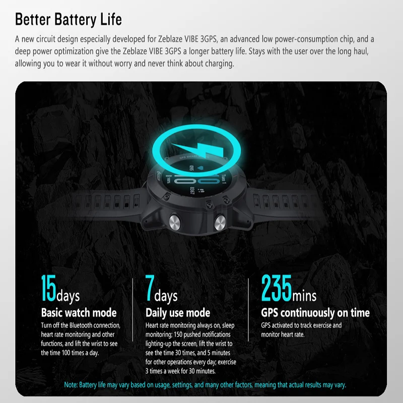 Смарт-часы VIBE 3GPS оснащены gps-отслеживанием, несколькими спортивными режимами, 24-часовым измерением сердца, мониторингом сна и т. д. Благодаря встроенному аккумулятору 280 мА · ч часы могут работать около 15 дней в базовом режиме часов. Подключение к приложению Fundo может помочь вашим часам получить больше функций и предоставить больше визуальных данных с новой открытой платформой Fundo. Водонепроницаемый дизайн IP67 позволяет смарт-часам иметь более длительное время службы, что обеспечивает удобство в повседневной жизни и работе.