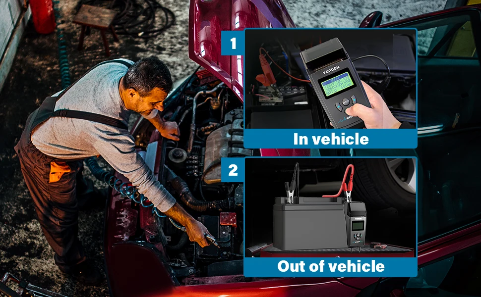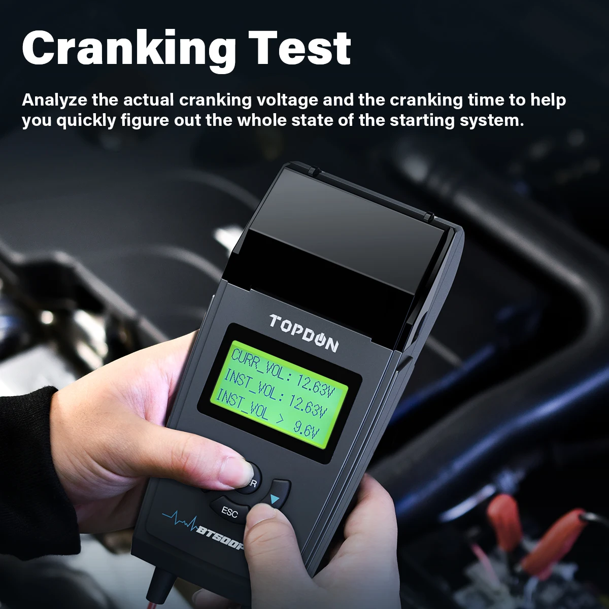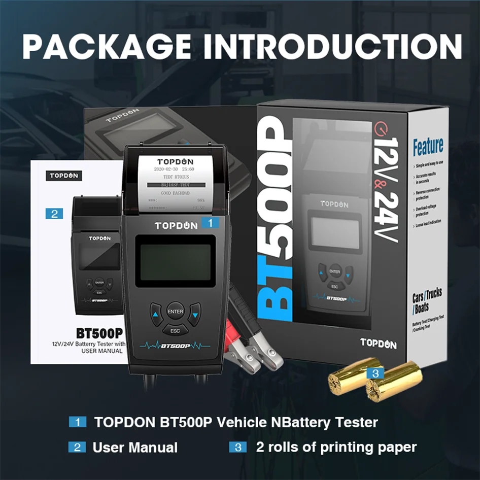 TOPDON BT500P servers как новый выпущенный автомобильный тестер батареи, и сочетает в себе самые передовые технологии тестирования проводимости, чтобы дать пользователям быстрые и точные результаты тестирования состояния батареи, запуска и зарядки системы, С защитой от обратной полярности и встроенным термопринтером и т. д., является простым решением для тестирования батареи для техников, профессионалов и DIYers.