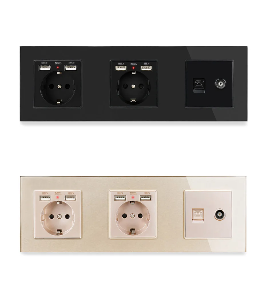UNKAS стандарт ЕС черная стеклянная панель двойная розетка с 4 USB зарядным портом + RJ11 телефонный разъем + ТВ разъем