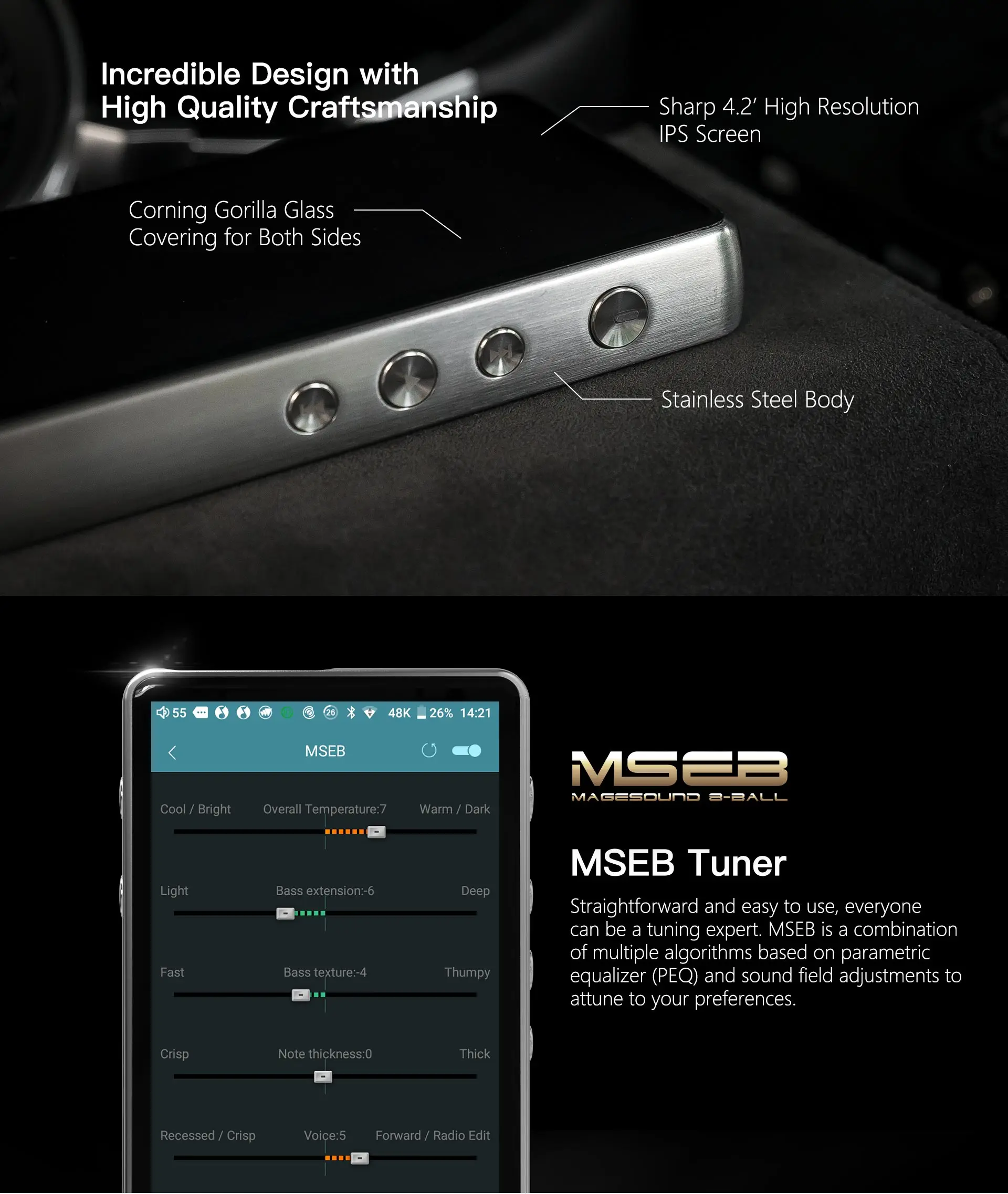 Благодаря последнему обновлению Android 8,1 его Интеллектуальная аудиосистема может предложить более гладкую и удобную музыку HiFi. Технология lts DTA Android global lossless output гарантирует, что звуковой выход и прием больше не будут мешать. Невероятный дизайн с высококачественным мастерством Sharp 4,2 «Разрешение IPS Экран Corning Gorilla Glass покрытие для обеих сторон Корпус из нержавеющей стали