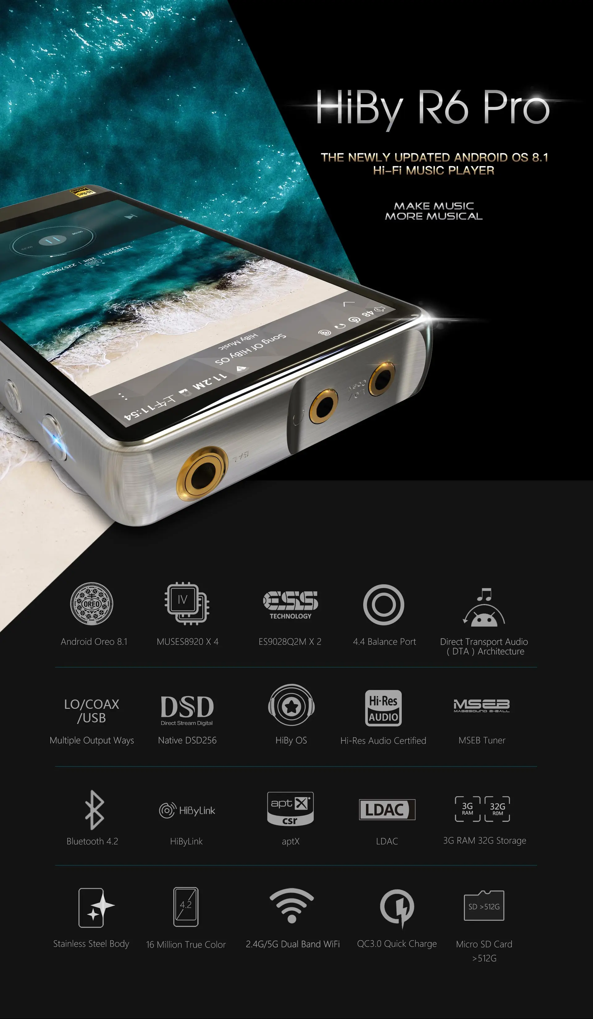 Android Oreo 8,1 MUSES8920 × 4 ES9028Q2M × 2 4,4 порт баланса DTA Transport Audio(DTA) архитектура Несколько способов вывода Native DSD256 HiBy OS Hi-Res аудио сертификат MSEB тюнер Bluetooth 4,2 HiByLink AptX LDAC 3G RAM 32G хранилище Корпус из нержавеющей стали 16 миллионов истинных цветов 2,4G/5G двухдиапазонный WiFi Быстрая зарядка QC3.0 Mico sd-карта> 512G