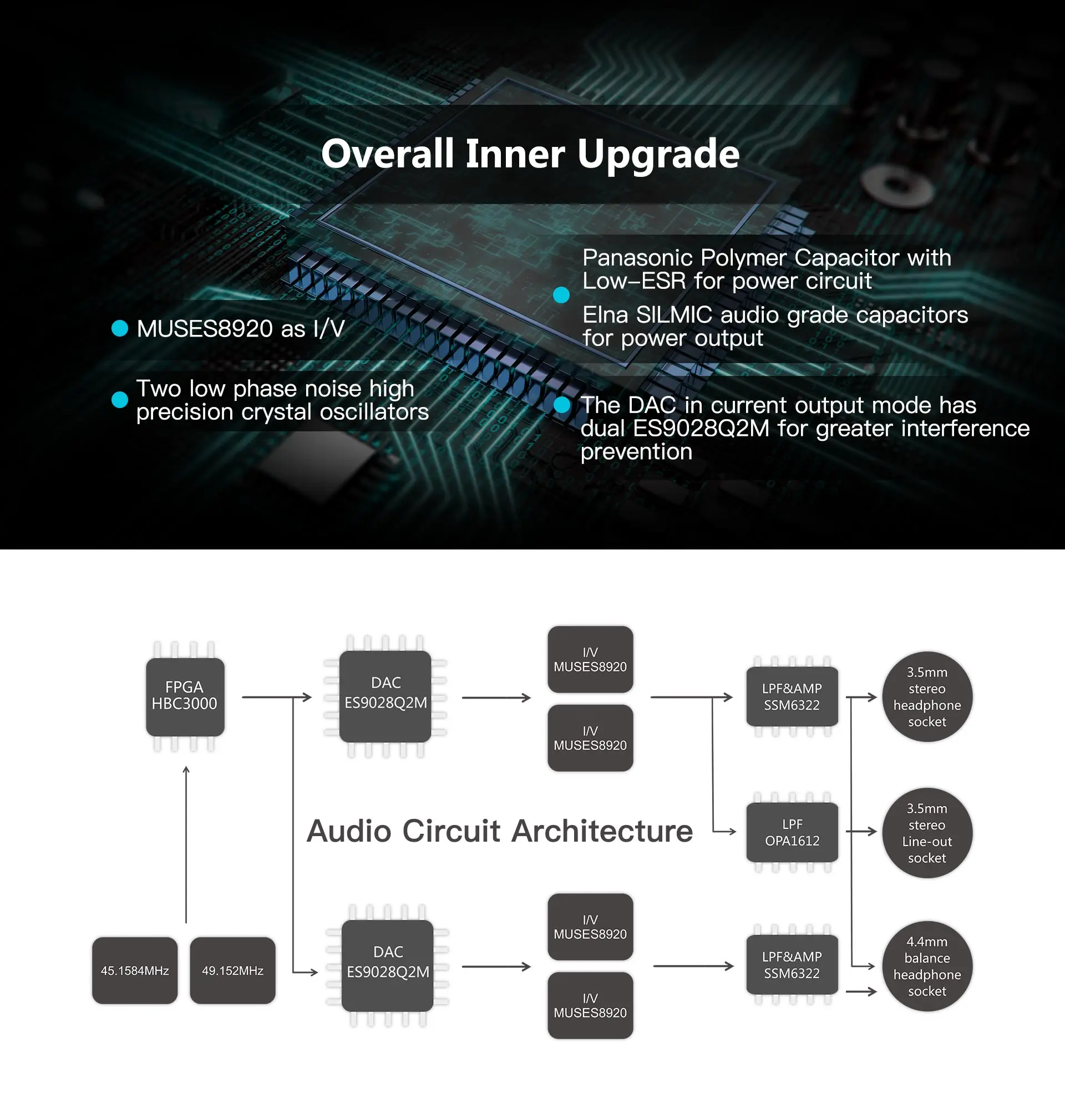 MUSES8920 as l/V Двухфазные высокоточные кристаллические Осцилляторы с низким уровнем шума Полимерный конденсатор Panasonic с низким ESR для силовой цепи Elna SILMIC аудио класса конденсаторы для выходной мощности DAC в режиме вывода тока имеет двойной Es9028Q2M для большей предотвращения помех