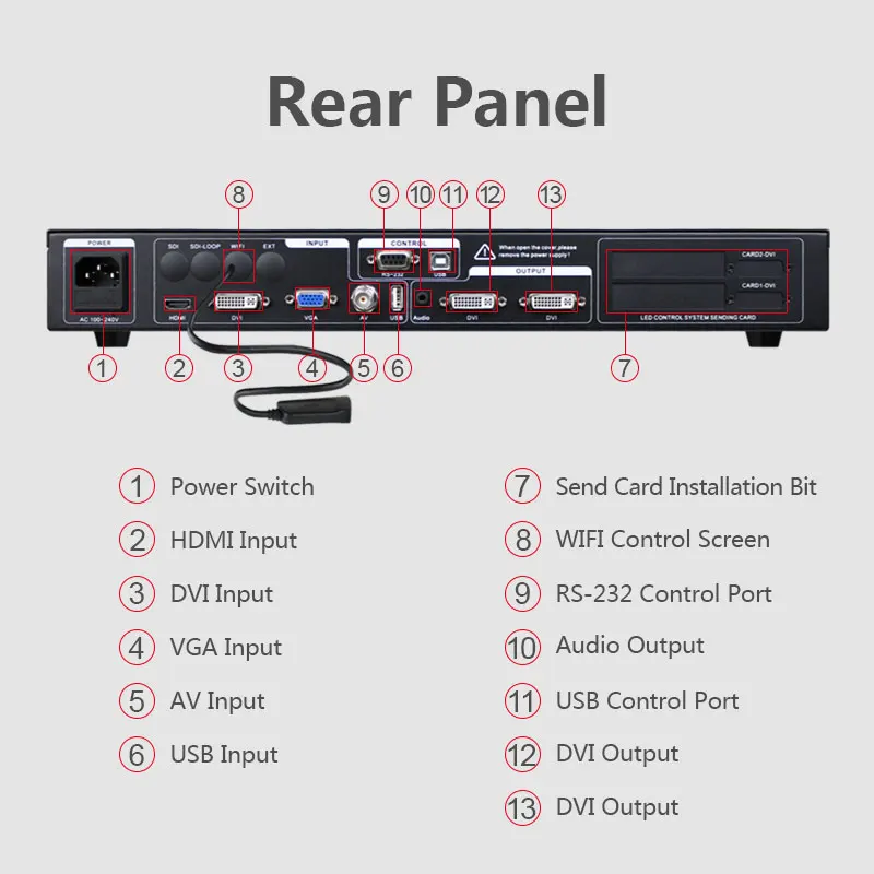 Несколько видео входов -- серия MVP300 использует 5 каналов видеовхода, включая 1 Композитный видео AV (CVBS), 1 канал VGA, 1 канал DVI, 1 канал HDMI, 1 канал USB. В основном, потребности для гражданского и промышленного использования были покрыты. Бесшовное переключение всех видео входов. Интерфейс видеовыхода -- серия MVP300 имеет 2 видеовыхода, 2 выхода DVI интерфейса s. 2 видео запрограммированы на светодиодный дисплей или карту отправки. Бесшовное переключение любого канала-видеопроцессор серии MVP300 также может легко переключаться между любыми каналами, быстро переключаться.