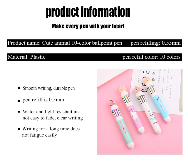 Product name: cute animal cartoon 10 color ballpoint pen Material: Plastic pen refill: 0.5 mm
