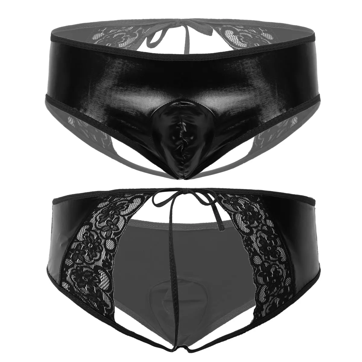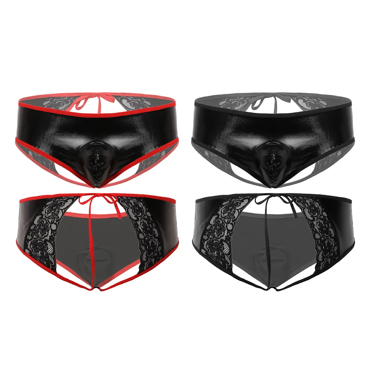 Черный или красный дизайн с окантовкой, с завязками на спине, передним выпуклом мешочком и открытым задником с кружевной отделкой.