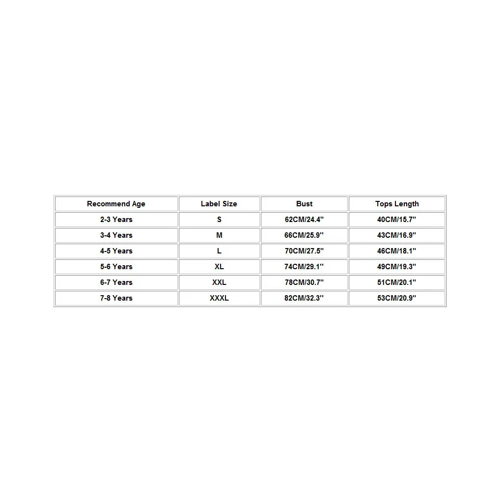 Рекомендуемый возраст Размер этикетки Бюст Длина топа От 2 до 3 лет S 62 см/24,4" 40 см/15,7" От 3 до 4 лет М 66 см/25,9'' 43 см/16,9" От 4 до 5 лет L 70 см/27,5" 46 см/18,1" От 5 до 6 лет XL 74 см/29,1'' 49 см/19,3" От 6 до 7 лет XXL 78 см/30,7" 51 см/20,1" От 7 до 8 лет XХХL 82 см/32,3'' 53 см/20,9"