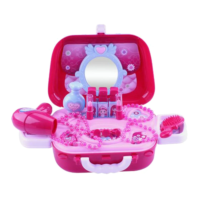 Модный набор для макияжа для детей. Небьющееся пластиковое зеркало, жемчужные браслеты и ожерелье, кольца, фен для волос, блеск для губ, помады, духи, лаки для ногтей, расческа для волос и наклейка для украшения набора макияжа. Это не настоящий макияж и не наносится на кожу.