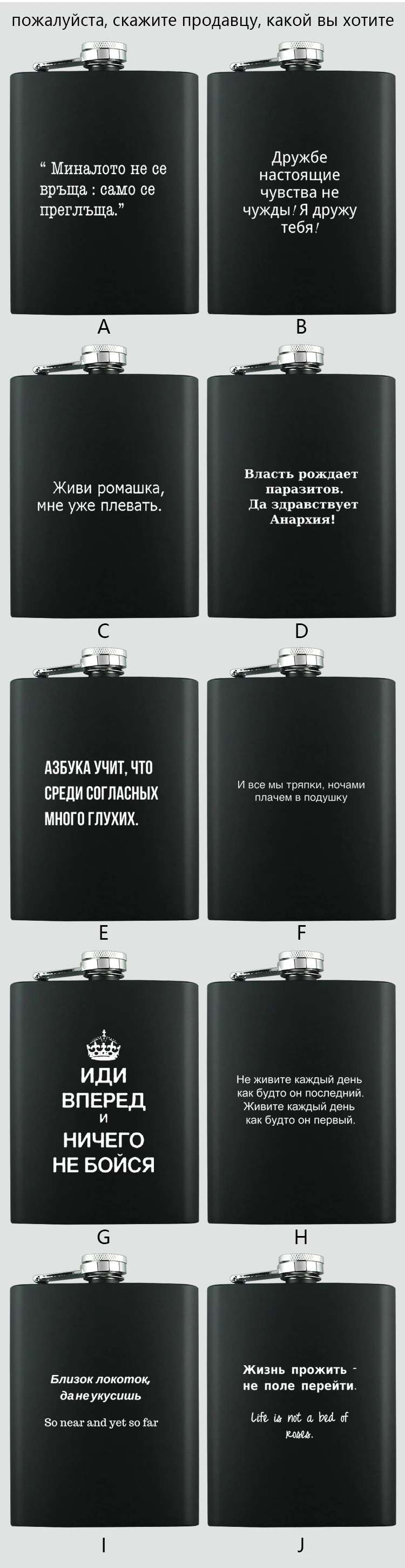 1. Доступны текст (на вашем языке), номер, логотип и простой рисунок. 2. Изображения и фото недоступны, спасибо за понимание. 3. Если вы хотите заказать фляжку, не забудьте отправить дизайн продавцу. Было бы очень полезно, если дизайн в векторе. Пожалуйста, не стесняйтесь связаться с продавцом для получения дополнительной информации.