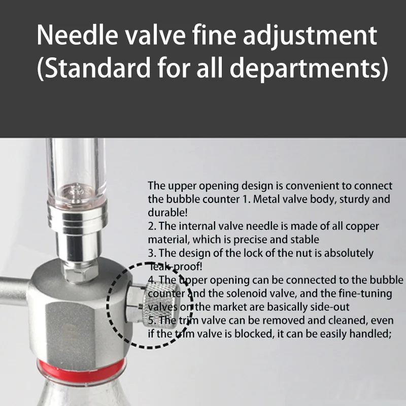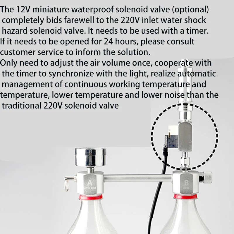 Соленоидный клапан: для управления включением и выключением генераторной системы C02 с помощью таймера (не входит в комплект) счетчик пузырьков с обратным клапаном: скорость потока СО2 прибора Индикации Газа и предотвращение потока воды