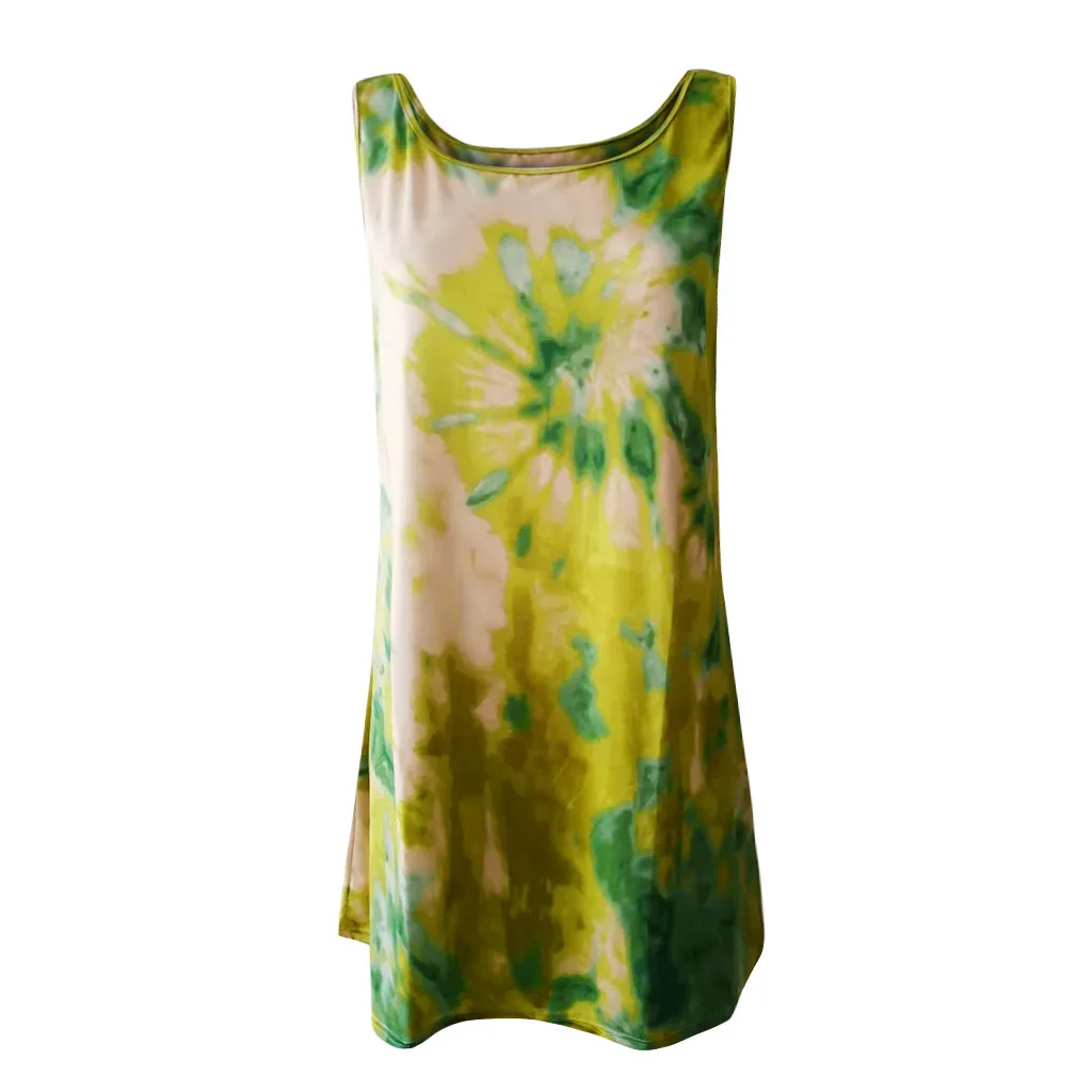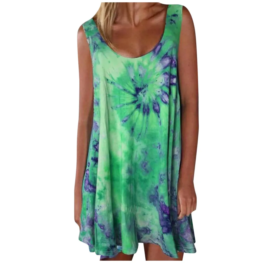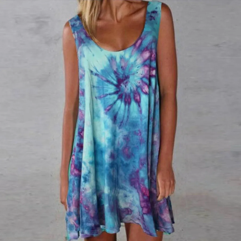 Модное женское повседневное разноцветное платье без рукавов с принтом в виде галстука-красителя и круглым вырезом, свободное платье