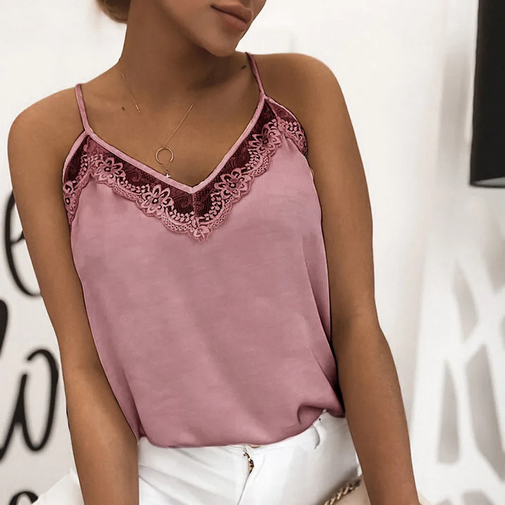 Особенности: v-образный вырез, сексуальная майкаОднотонная пикантная одеждаКружева, перспектива, стильный и модный дизайн, Летние повседневные топы.