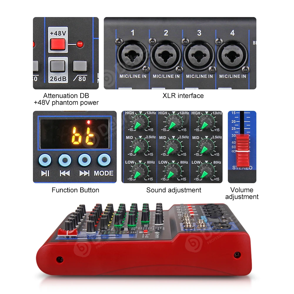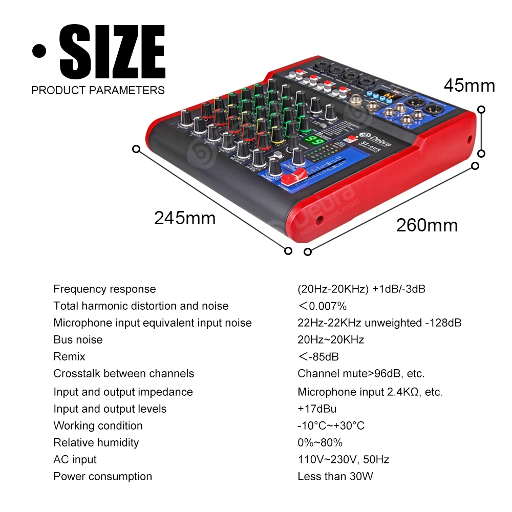 Особенности: 2 микрофона/линейный вход, 1 стерео линейный вход Индикация фазы, уровня и перегрузки 1 вспомогательный отправить MP3, звуковая карта, USB вход/выход для записи воспроизведения Низкий средний фильтр (80 Гц) 99 DSP сцены эффекты Одноканальный переключатель (26 дБ) Параметры: Эквалайзер: высокий +/- 15 дБ @ 12 кГц MID +/- 15 дБ @ 2,5 кГц Низкий +/- 15 дБ @ 80 кГц Входное сопротивление: MIC3.8KΩ, другой вход s: ≥ 10 kΩ Выходное сопротивление: 120 не параллельных, 240Ω параллельных, 22Ω наушников Частотная характеристика: 20 Гц-30 кГц + 0 / -1 дБ Искажения: <0.01%