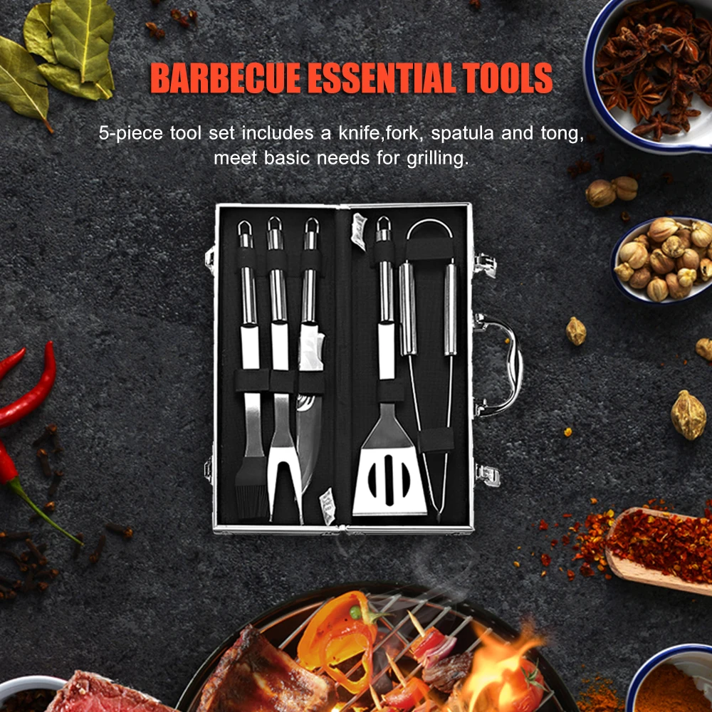 Набор инструментов из 5 предметов включает в себя нож, вилку, лопатку, Тонг и щетку для протирания, удовлетворяя основные потребности в гриле.