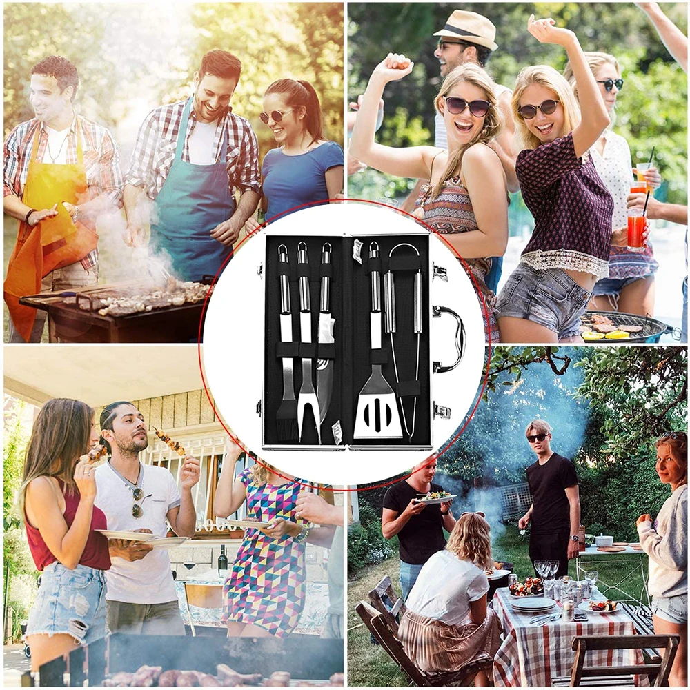 Этот набор инструментов для барбекю состоит из 5 частей, включая нож, вилку, лопатку, Тонг и щётку, которые изготовлены из нержавеющей стали, устойчивы к ржавчине и долговечны. Он может удовлетворить ваши основные потребности в гриле и поставляется в чехол для хранения, удобный и портативный.