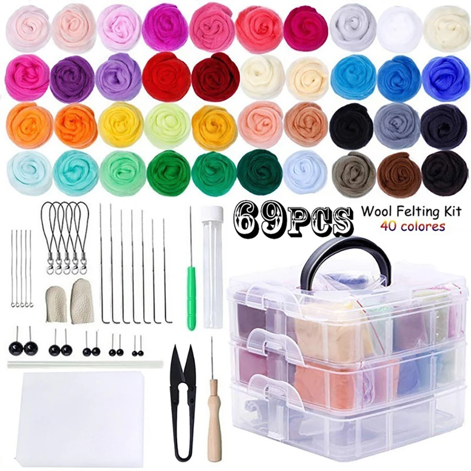 40 цветов шерстяного фетра, в рулоне: 3 г Трехслойный ящик для хранения * 1 (разделительный слой, съемный) 2 * напальчники (случайный цвет) 1 * деревянная ручка 1 * Пластиковая ручка (случайный цвет) 7 * протыкать иглу 1 * бутылка для игл Глаза игрушки: 5 пар 5 * шнурок с металлической застежкой 1 * маленький клей-карандаш 5*9-контактов 1 * ножницы (случайный цвет)