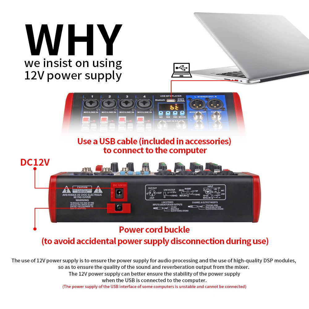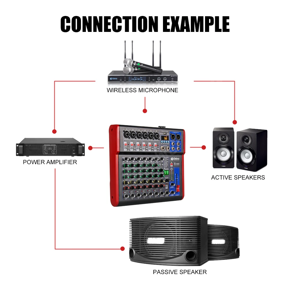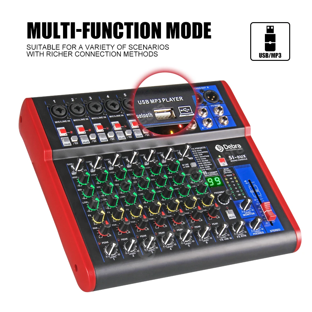 Особенности: 6 микрофонов/линейный вход, 1 стерео линейный вход Индикация фазы, уровня и перегрузки 1 вспомогательная отправка MP3, звуковая карта, USB вход/выход для записи воспроизведения Низкий средний фильтр (80 Гц) 99 DSP эффекты сцены Одноканальный переключатель (26 дБ) Параметр: Эквалайзер: высокий +/- 15 дБ @ 12 кГц MID +/- 15 дБ @ 2,5 кГц Низкий +/- 15 дБ @ 80 кГц Входное сопротивление: MIC3.8KΩ, другой вход s: ≥ 10 kΩ Выходное сопротивление: 120 не параллельных, 240Ω параллельных, 22Ω наушников Частотная характеристика: 20 Гц-30 кГц + 0 / -1 дБ Искажение: <0.01%
