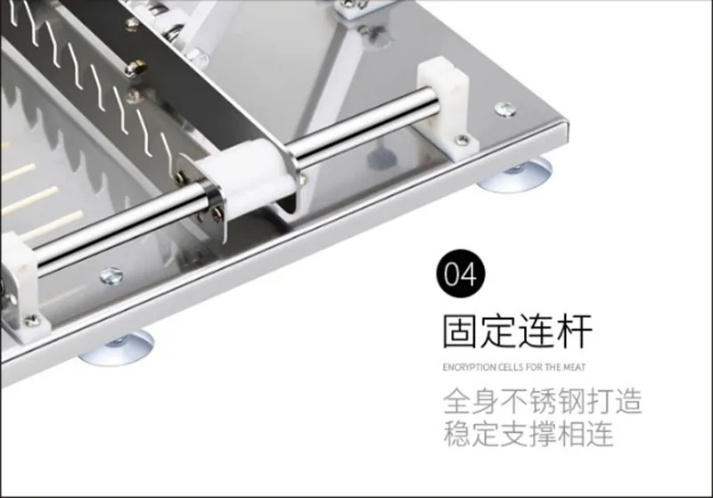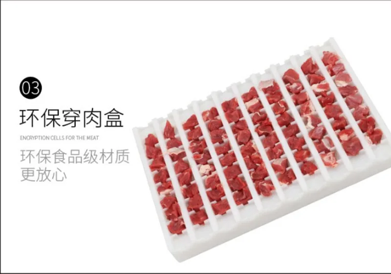 Нержавеющая сталь, пищевой PE материал, в соответствии с международными требованиями к гигиене пищевых продуктов; Настольный контроль, удобное движение, небольшой размер; Стабильная работа; Точная и разумная планировка, без обслуживания, длительный срок службы; Мобильная ПЭ форма для мяса, удобная чистка; Может свободно менять форму для удовлетворения потребностей различных продуктов.